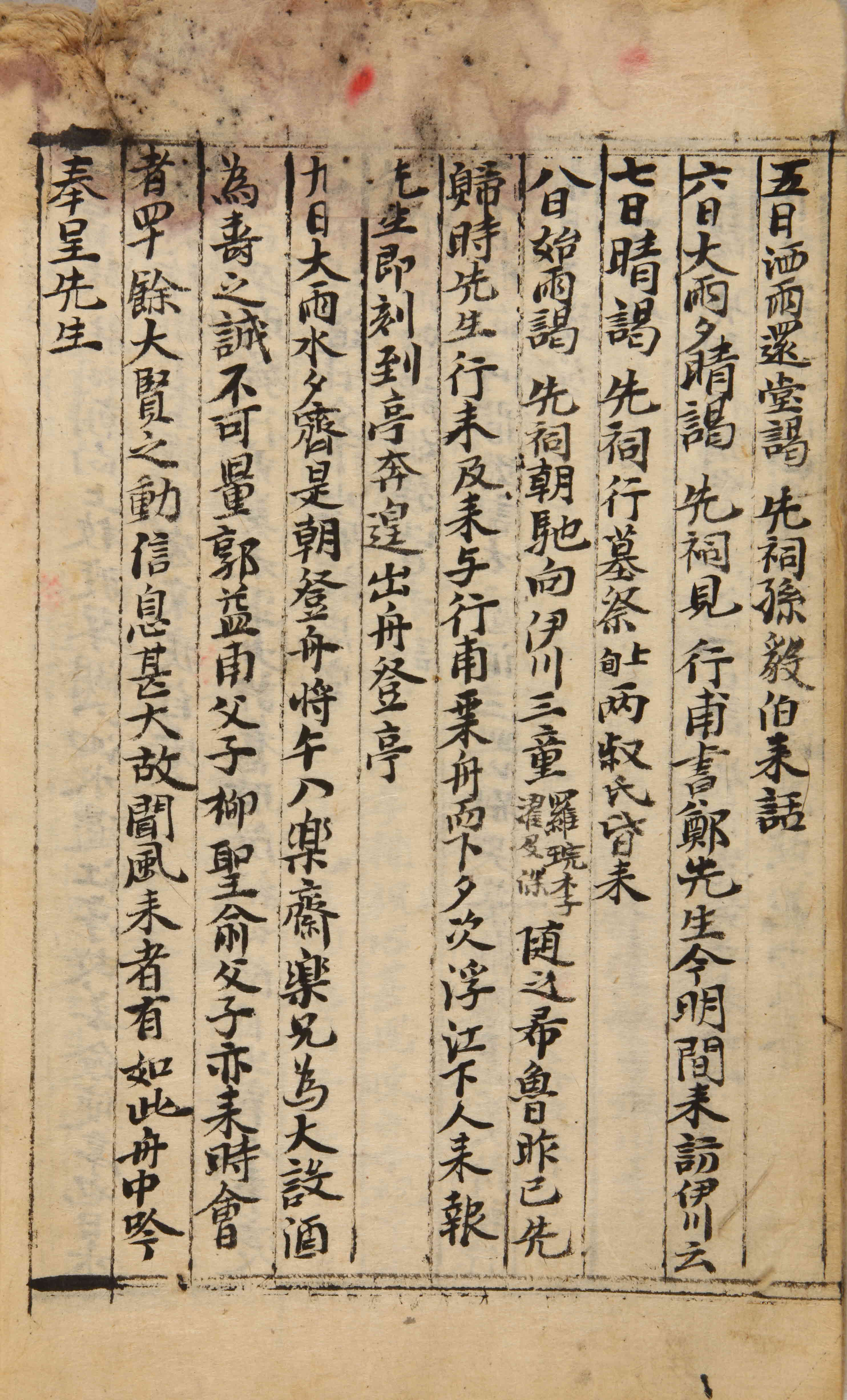 선사(先祠)에 배알을 했다. 아침에 말을 타고 이천(伊川)으로 향했다. 세 명의 아이가 그곳으로 따라왔다.【나완(羅琓), 이탁(李濯)과 설(渫)[손설(孫渫)]이다.】 희로(希魯)[손처약(孫處約)]는 어제 이미 먼저 돌아갔다. 이때 선생(先生)의 행차는 아직 오지 않았다. 행보(行甫)[서사원(徐思遠)]와 함께 배를 타고 내려갔다. 저녁에 부강(浮江)에 있었는데 하인이 와서 선생께서 막 정자에 도착하였다고 알렸다. 황급하게 배에서 나와 정자로 올라갔다.