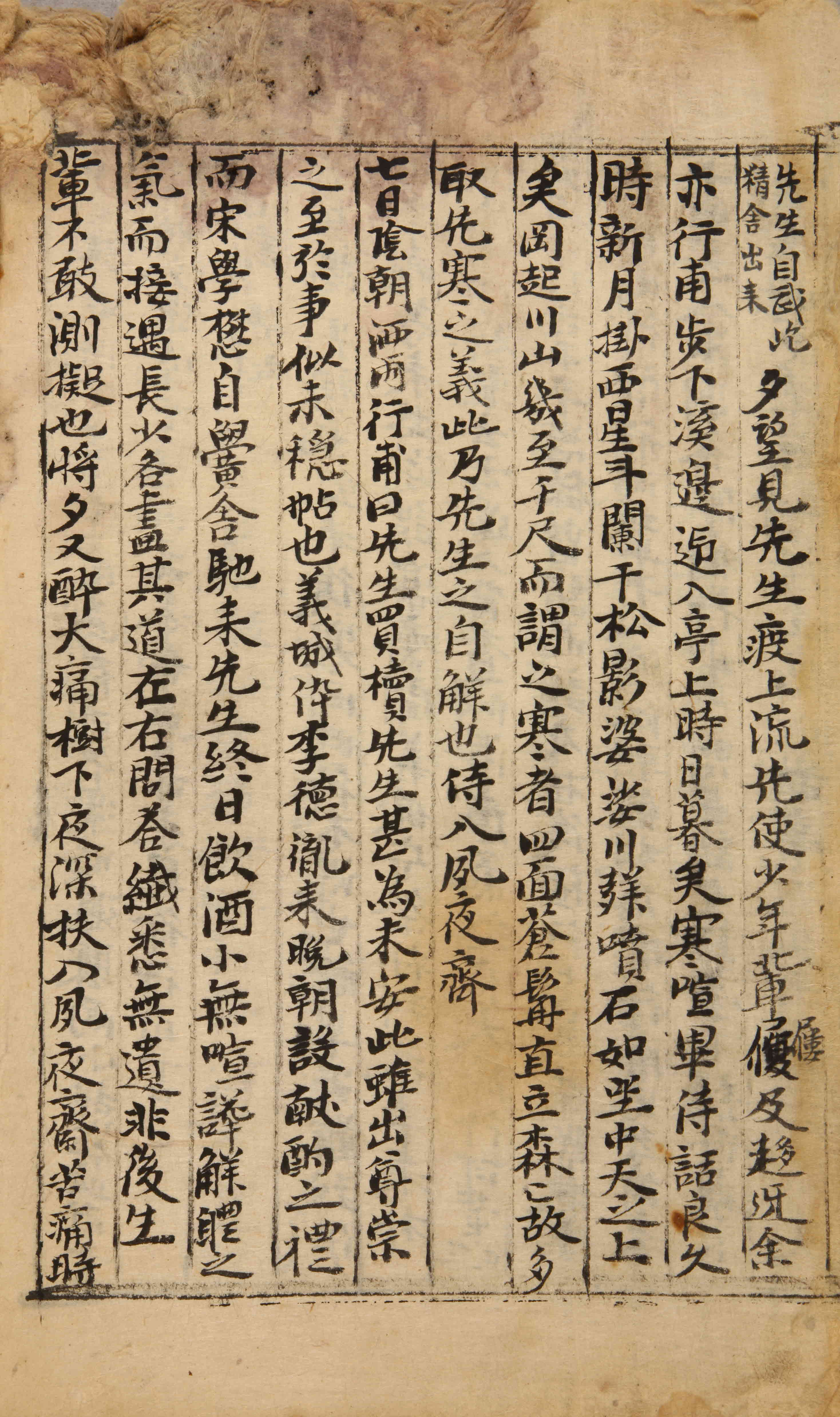 氣甚不平。思欲留調。而諸友在後獨行。尤甚無聊。扶病强隨同行。徐行可輩十人渡江。朝飯村店。聞行甫兄去前未十里云。入沙陶谷亭樹。行甫已憩。與諸友話亭下。頹臥幾不省事。將夕乘凉踰嶺。至寒岡新亭。先生出山。時未還矣。【先生自武屹精舍出來。】夕望見先生渡上流。先使少年輩。屨及趍迓。余亦行甫步下溪邊。迎入亭上。時日暮矣。寒喧畢。侍話良久。時新月掛西。星斗闌干。松影婆娑。川聲噴石。如坐中天之上矣。岡起川山。幾至千尺。而謂之寒者。四面蒼髥。直立森森。故多取先寒之義。此乃先生之自解也。侍入夙夜齊。