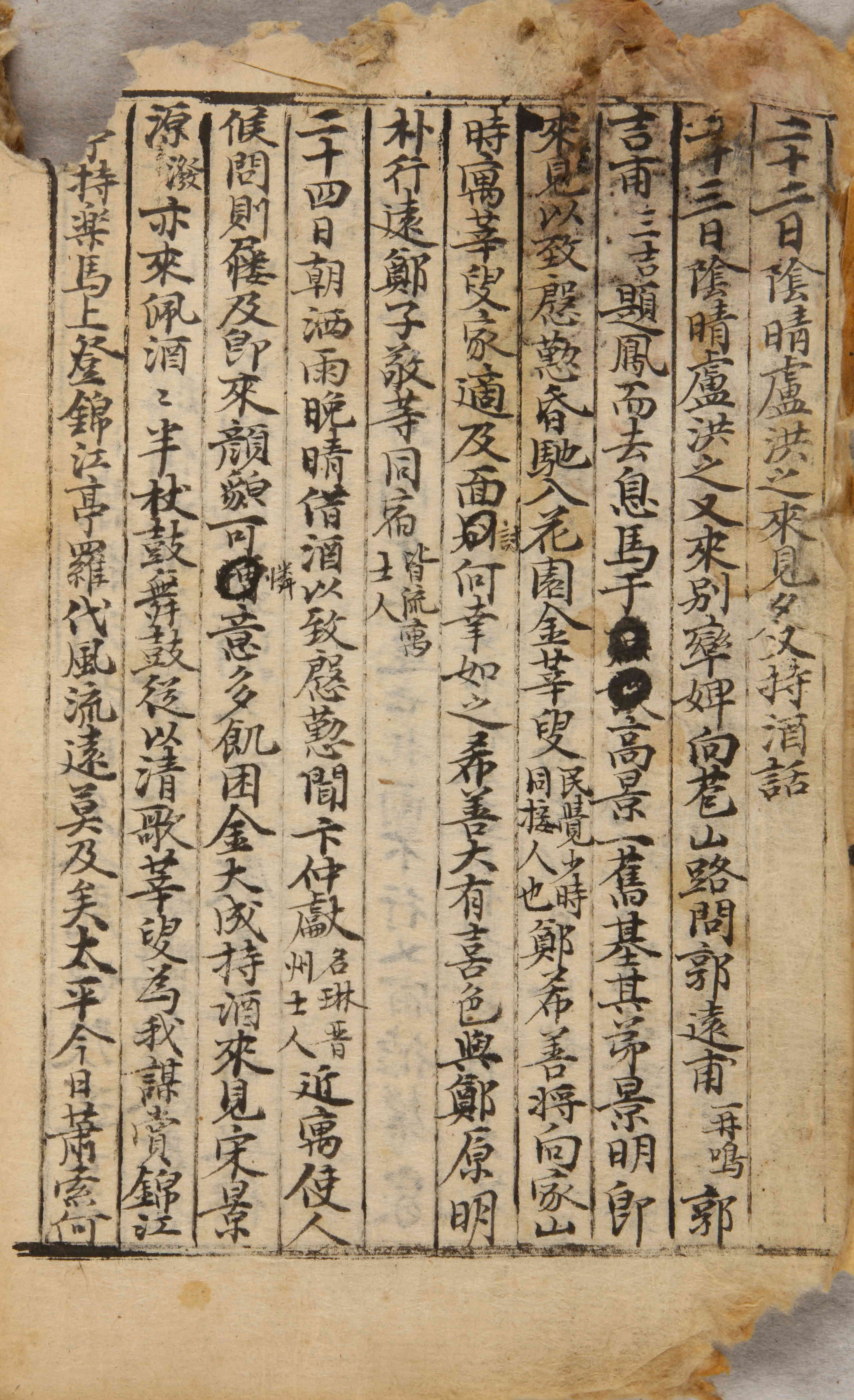 朝灑雨。晩晴。借酒以致慇懃。聞卞仲獻【名琳。晉州士人。】近寓。使人候問。則屨及卽來。顔貌可■〔憐〕。意多飢困。金大成持酒來見。宋景源【潑】亦來佩酒。酒半杖鼓舞鼓從以淸歌。莘叟爲我謀賞錦江▣(亭)。持樂馬上。登錦江亭。羅代風流。遠莫及矣。太平今日。蕭索何極。感意難禁。佩酒者。幾至七八。酒酣。作隊起舞。巖下行人。望見指示曰。亂後何人羽化登仙也。吟近體一律。贈鄭希善。