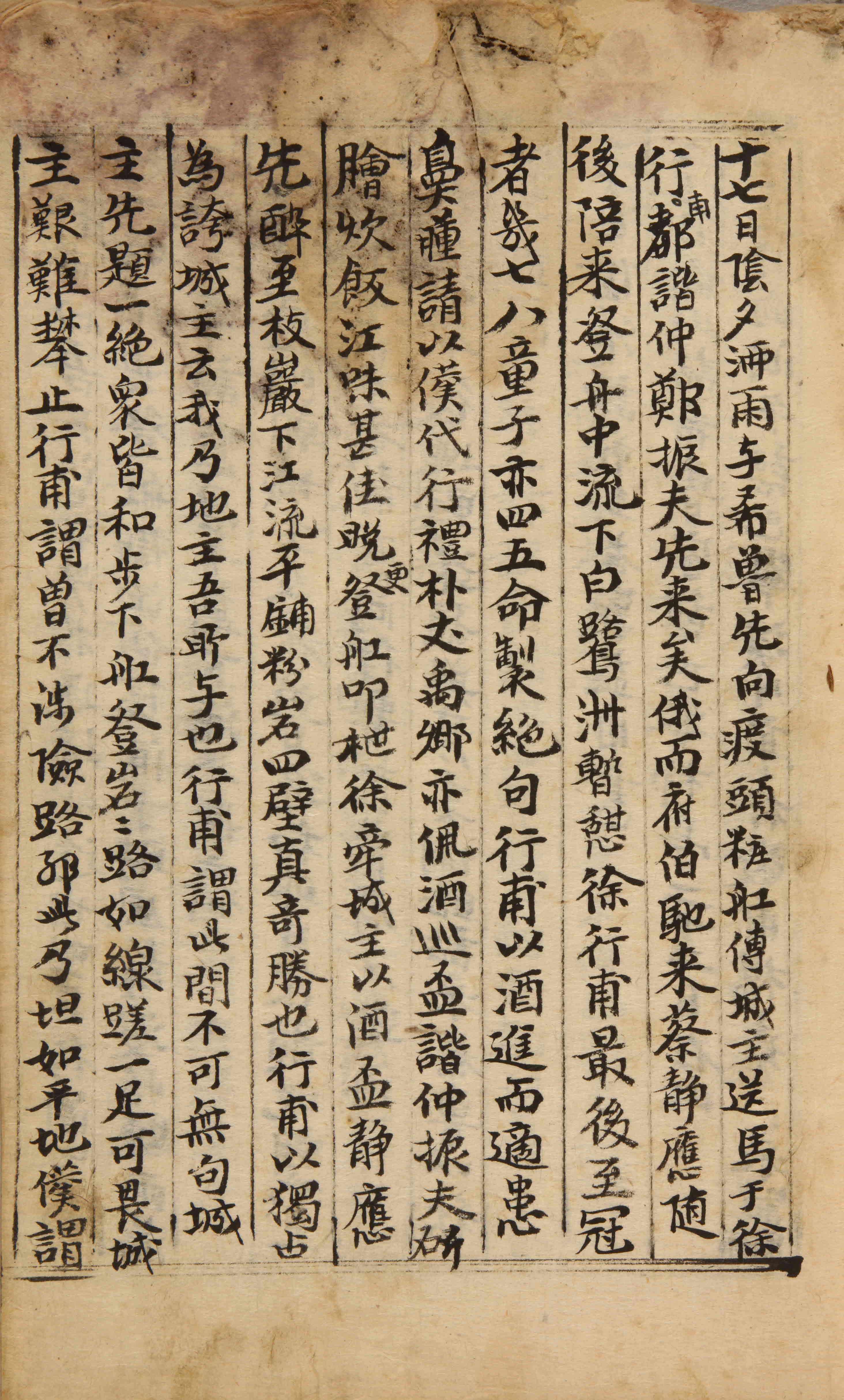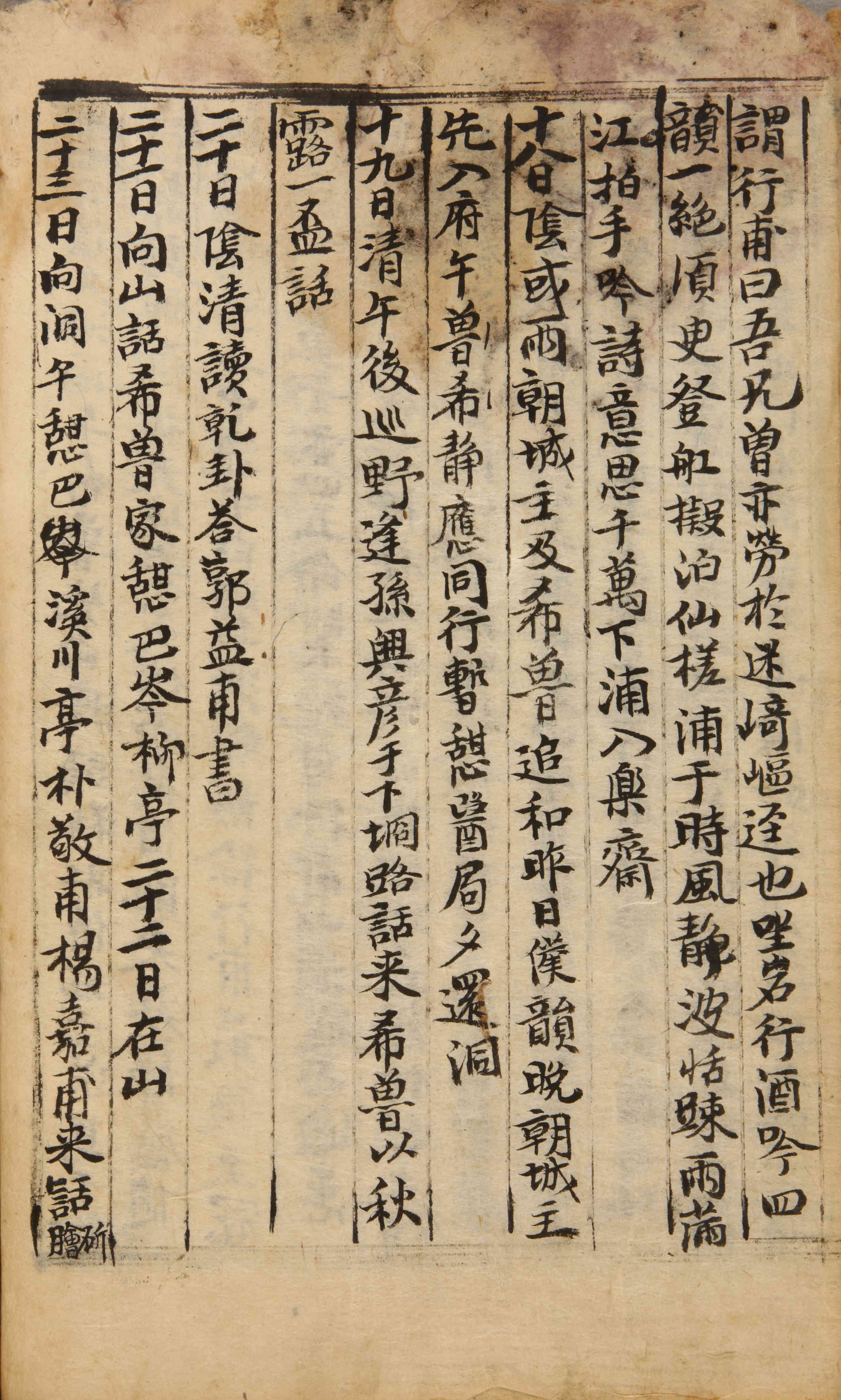 陰。夕灑雨。與希魯。先向渡頭。粧舡傳城主。送馬于徐行甫都諧仲鄭振夫先來矣。俄而府伯馳來。蔡靜應隨後陪來。登舟中流下白鷺洲。暫憩。徐行甫最後至。冠者幾七八。童子亦四五。命製絶句。行甫以酒進。而適患鼻腫。請以僕代行禮。朴丈禹鄕。亦佩酒巡盃。諧仲振夫。斫膾炊飯。江味甚佳。晩更登舡。叩枻徐牽。城主以酒盃。靜應先醉。至枝巖下。江流平鋪。粉岩四壁。眞奇勝也。行甫以獨占爲誇。城主云。我乃地主。吾所與也。行甫謂此間不可無句。城主先題一絶。衆皆和。步下舡登岩。岩路如線。蹉一足可畏。城主艱難攀止行甫。謂曾不涉險路耶。此乃坦如平地。僕謂謂行甫曰。吾兄曾亦勞於迷崎嶇逕也。坐岩行酒。吟四韻一絶。須臾登舡。擬泊仙槎浦。于時風靜波恬。疎雨滿江。拍手吟詩。意思千萬。下浦入樂齋。