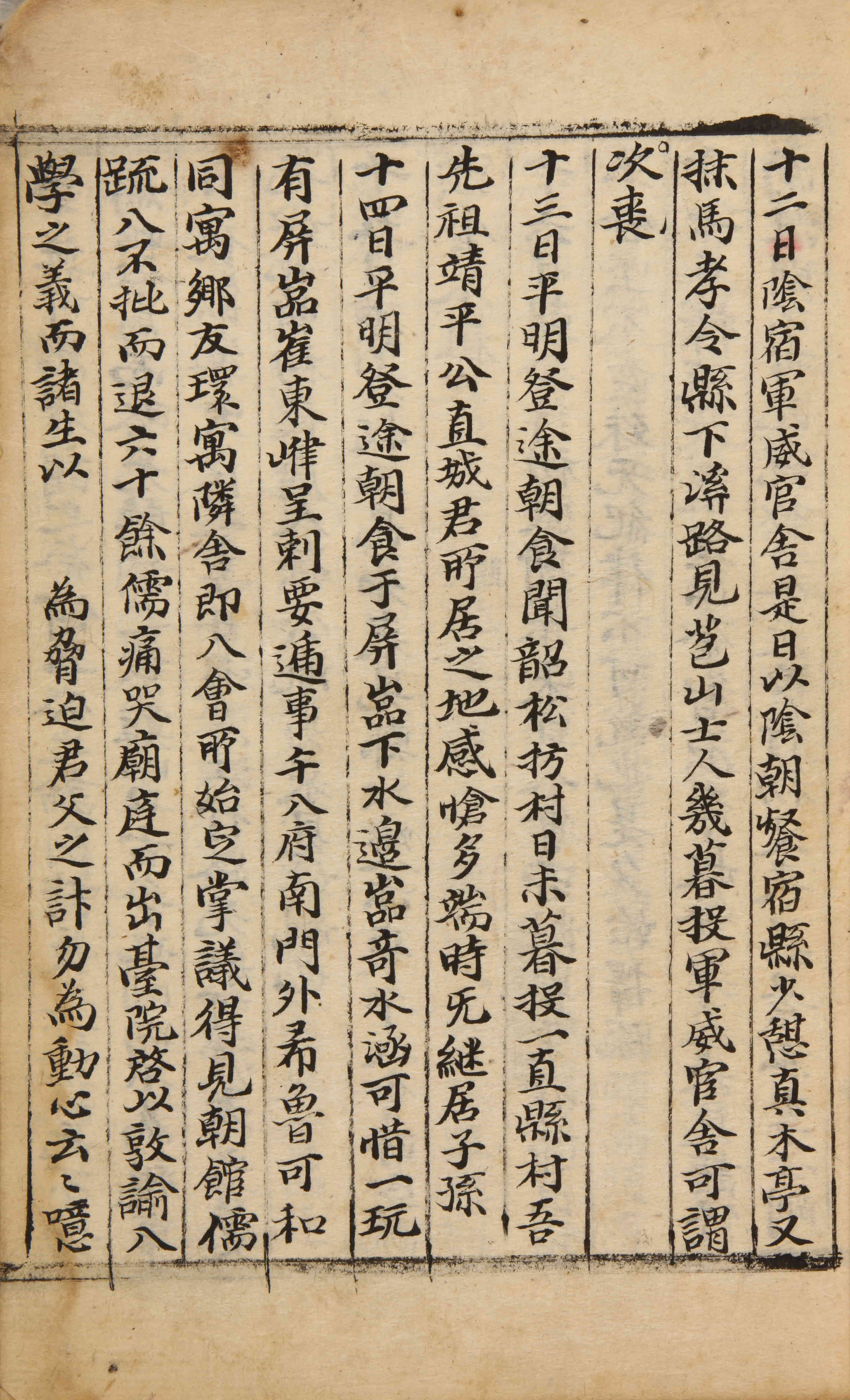 陰。宿軍威官舍。是日以陰。朝餐宿縣。少憩眞木亭。又抹馬孝令縣下溪。路見苞山士人。幾暮投軍威官舍。可謂喪次。