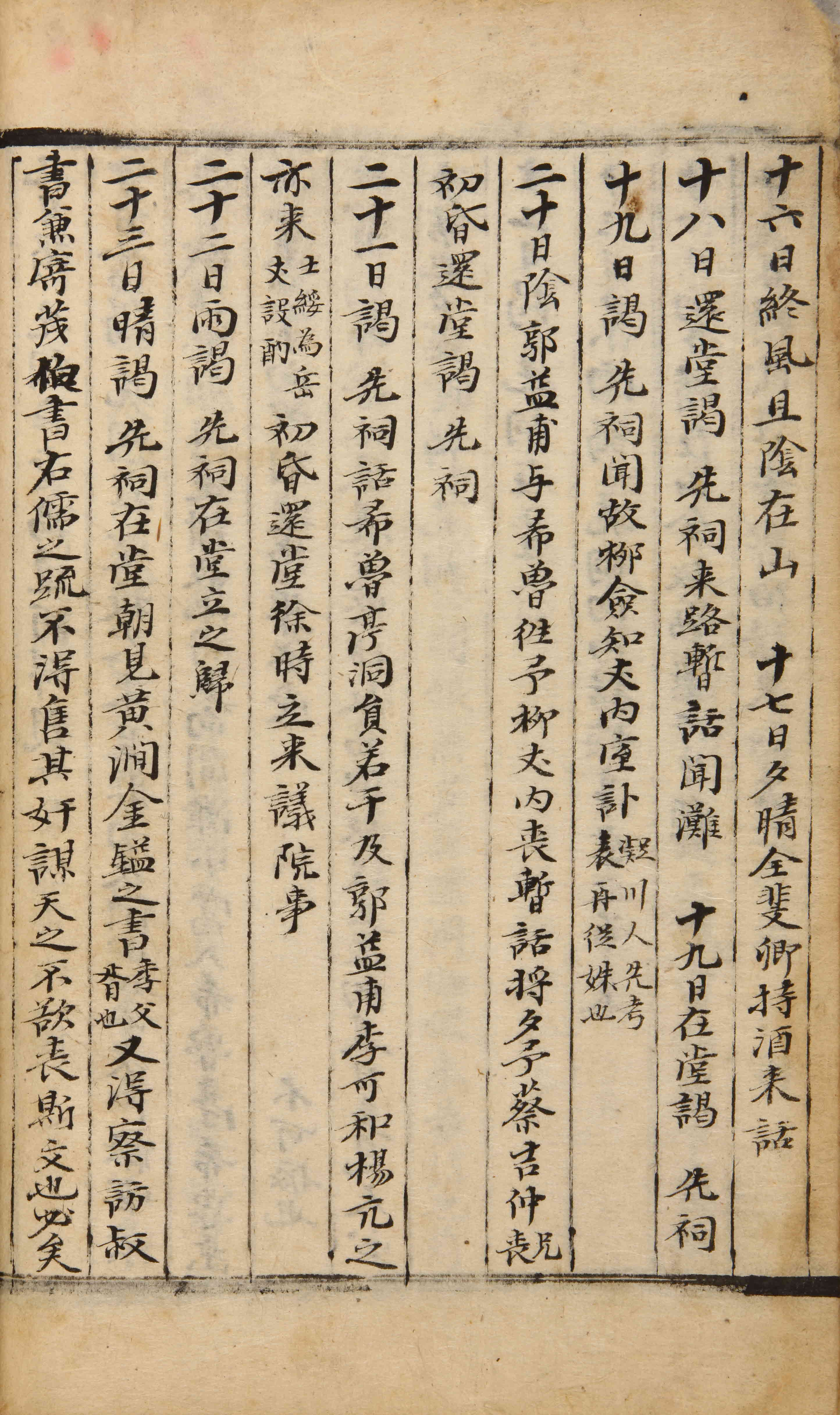 晴。謁先祠。在堂。朝見黃澗金鎰之書。【季父胥也】又得察訪叔書。兼寄茂伯書。右儒之疏。不得售其奸謀。天之不欲。喪斯文也。必矣。備忘記略曰。成博以小子後生。何所知識。而一以攻大賢【退溪】。一以攻大臣。【首相李德馨也】必空人國而後已。朝家大靖之端。始自布衣。予甚慘焉。故不踏啓字以下。政院知悉云云。上雖有典從之意。而朝野雷同。皆曰兩賢【晦退】。彼右若干邑人。雖論立異。勢不可捨公而從曲也。且鄭景任城主【經世】被重駁。遆差湖南巡使之任。令人不覺氣塞。斯人有斯咎耶。正言姜益文主之。前日之駁。亦被鄭老之指手云。朝後致齊希魯家。【明日王父忌。以家疫未久。故不行於廟。】見永陽姑夫鄭察訪尊丈書。助送祭物。夜分城主自本家還。路不意馳入尊。不敢告以致齊之故。