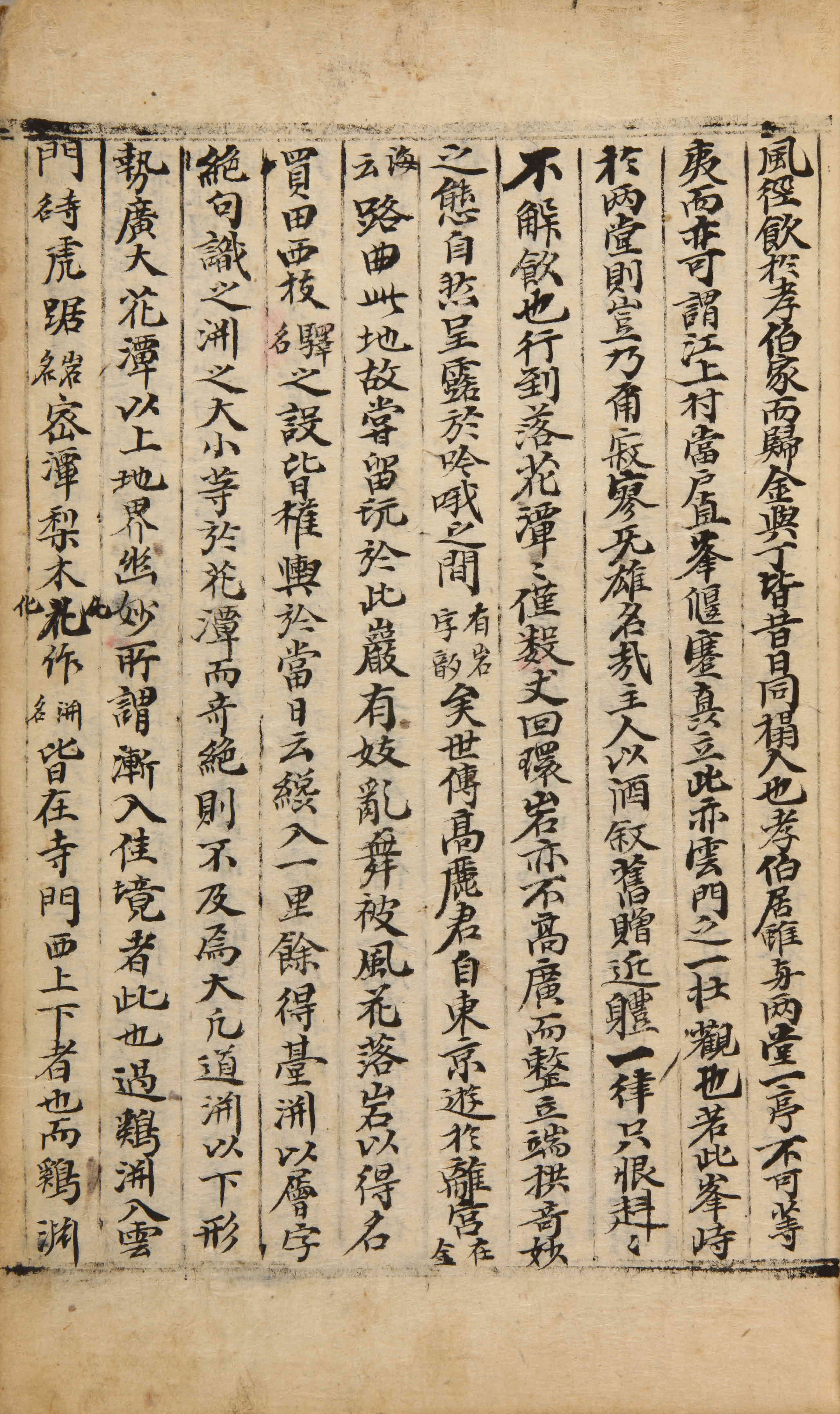 早朝向道淵亭。孝伯從。家在上流亭。乃金公致三一之之所買屋也。暫居出世。棄而不治。上雨旁風。窓飛壁落。埋沒形狀。殊不可觀。距逍遙僅五里。山形水勢。立亭基址。亞於兩堂者也。惜哉。留題以諷之情字絶句也。朝食西枝。金丈遇錘丁公敏道措酒來見。皆期以酌話落花之潭。而金丈不可以風。徑飮於孝伯家而歸。金與丁皆昔日同榻人也。孝伯居。雖與兩堂一亭。不可等夷。而亦可謂江上村當戶直峯偃蹇矗立。此亦雲門之一壯觀也。若此峯峙於兩堂。則豈乃爾寂寥無雄名哉。主人以酒敍舊。贈近體一律。只恨赳赳不解飮也。行到落花潭。潭僅數丈。回環岩亦不高廣。而整立端拱。奇妙之態。自然呈露於吟哦之間【有岩字韻】矣。世傳高麗君。自東京遊於離宮。【在金海云】路曲〖由〗此地。故嘗留玩於此巖。有妓亂舞被風。花落岩以得名。買田西枝【驛名】之設。皆權輿於當日云。纔入一里餘。得臺淵以層字絶句識之。淵之大小等於花潭。而奇絶則不及焉。大凡道淵以下。形勢廣大。花潭以上。地界幽妙。所謂漸入徍境者此也。過鷄淵。入雲門。【寺名】虎踞【岩名】密潭梨木化作。【淵名】皆在寺門西上下者也。而鷄淵虎峯以相鎭壓而得名。此乃相地誣人之說。吾不信也。至於梨木【有■一子梨木在雲門。嘗遊於此淵。雖它處苦旱。而染墨大筆一揮。則雨下卽下。园蔬每沃若。故以梨木名淵。梨木龍孫也。】化作。【龍王聞梨木注雨。大怒命招之。乃於梨木淵上流。化作躍飛。破前山崑崙而去。此其化作淵也。】則尤爲荒唐之言。傳之亦不聽取。而巖奇水淸。地僻境幽。所謂別有天地非人間者也。殿舍頹壞。僅存法堂。墻庭蕪沒。只記禪塔。此則後來遊覽者之一欠事也。初昏舍于東房。老僧二人燃火以待。臺淵至化作皆有絶句吟。