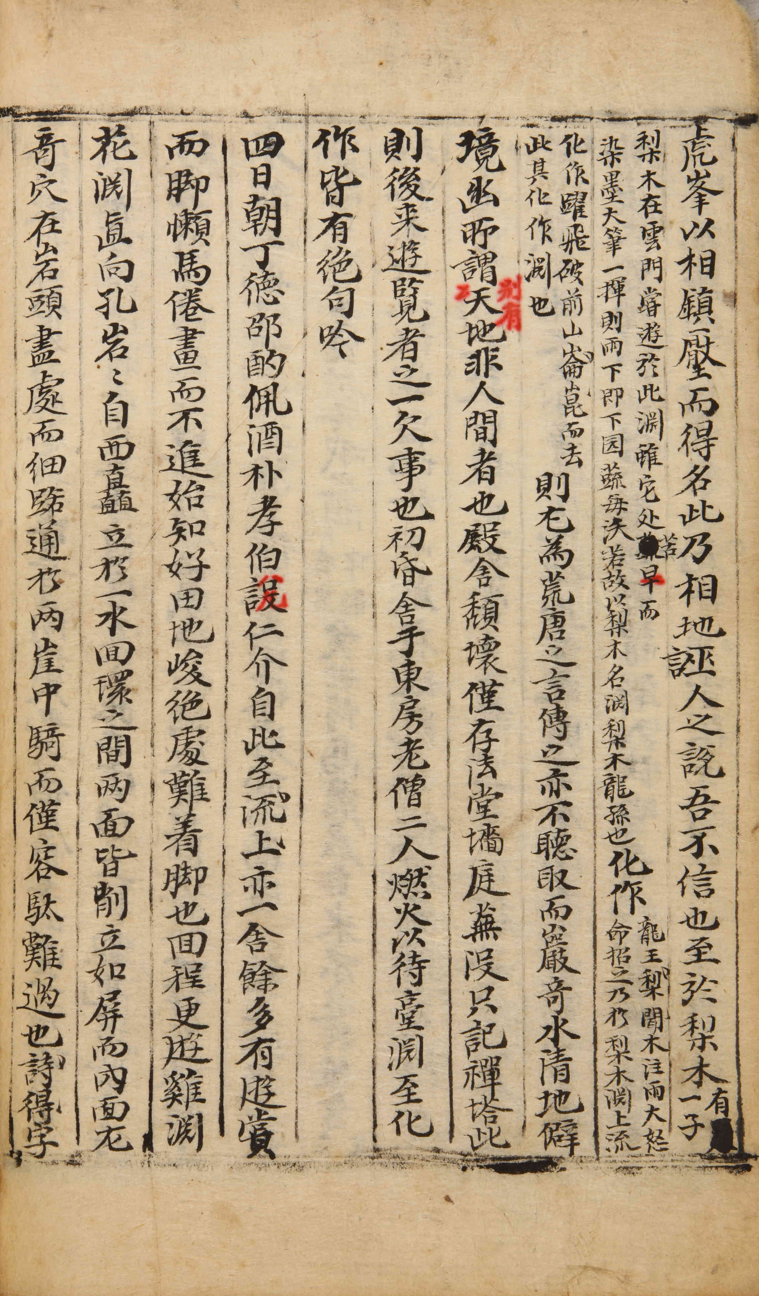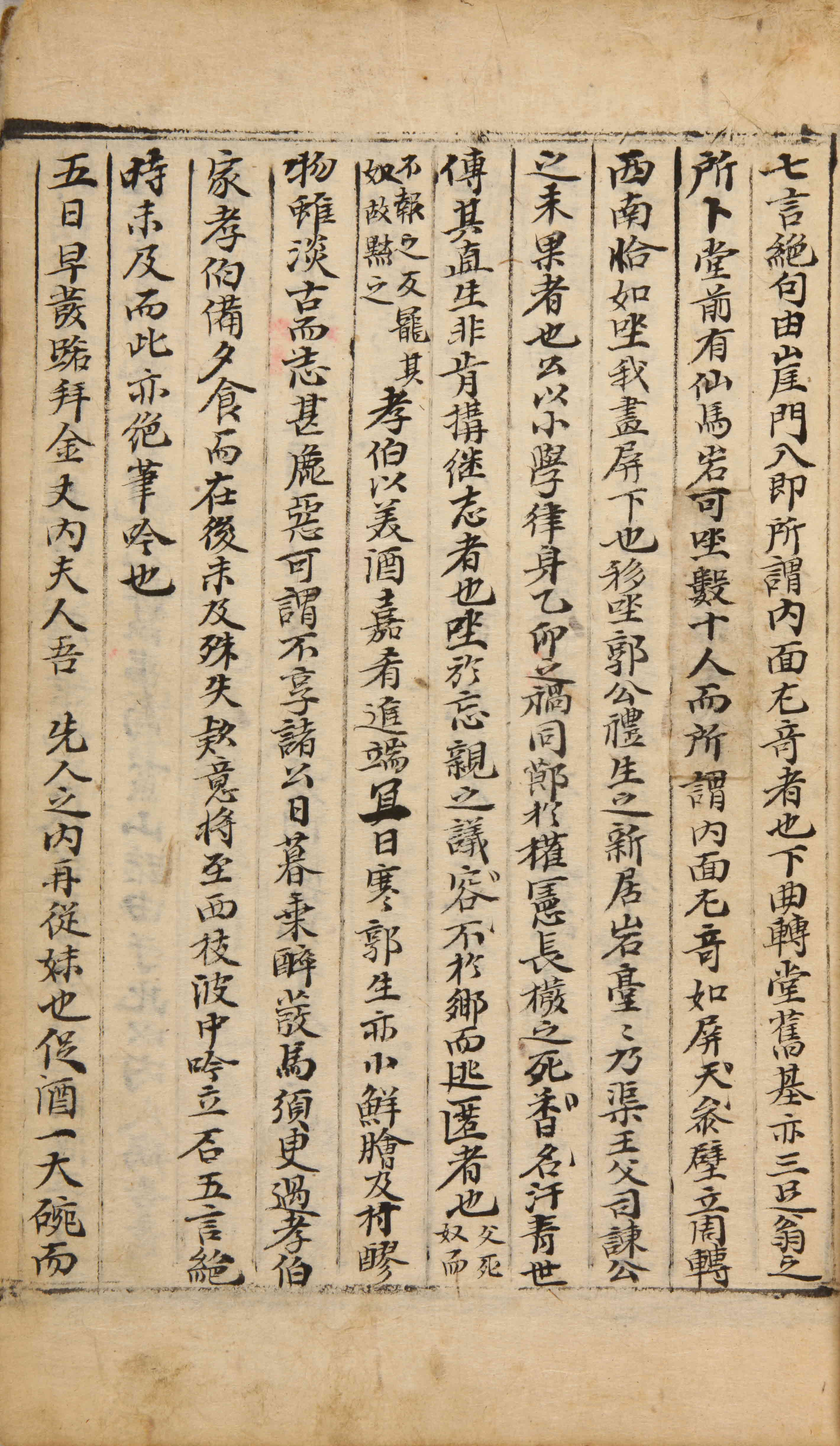 朝丁德邵酌佩酒。朴孝伯說仁介。自此至上流。亦一舍餘。多有遊賞。而脚懶馬倦。畫而不進。始知好田地峻絶處。難着脚也。回程更遊鷄淵花淵。直向孔岩。岩自西矗立於一水回環之間。兩面皆削立如屛。而內面尤奇。穴在岩頭盡處。而細路通於兩崖中。騎而僅容。馱難過也。得詩字七言絶句。由崖門入。卽所謂內面尤奇者也。下曲轉堂舊基。亦三足翁之所卜。堂前有仙馬岩。可坐數十人。而所謂內面尤奇。如屛參天壁立。周轉西南。恰如坐我畵屛下也。移坐郭公禮生之新居岩臺。臺乃渠王父司諫公之未果者也。公以小學律身。乙卯之禍。同節於權憲長橃之死。名香汗靑。世傳其直。生非肯搆繼志者也。坐於忘親之議。不容於鄕。而逃匿者也。【父死奴而不報之。反寵其奴。故黜之。】孝伯以美酒嘉肴進。端宜日寒。郭生亦小鮮膾及村醪。物雖淡古。而志甚麁惡。可謂不享。諸公日暮乘醉發馬。須臾過孝伯家。孝伯備夕食。而在後未及。殊失款意。將至西枝。波中吟立石五言絶。時未及而此亦絶筆吟也。