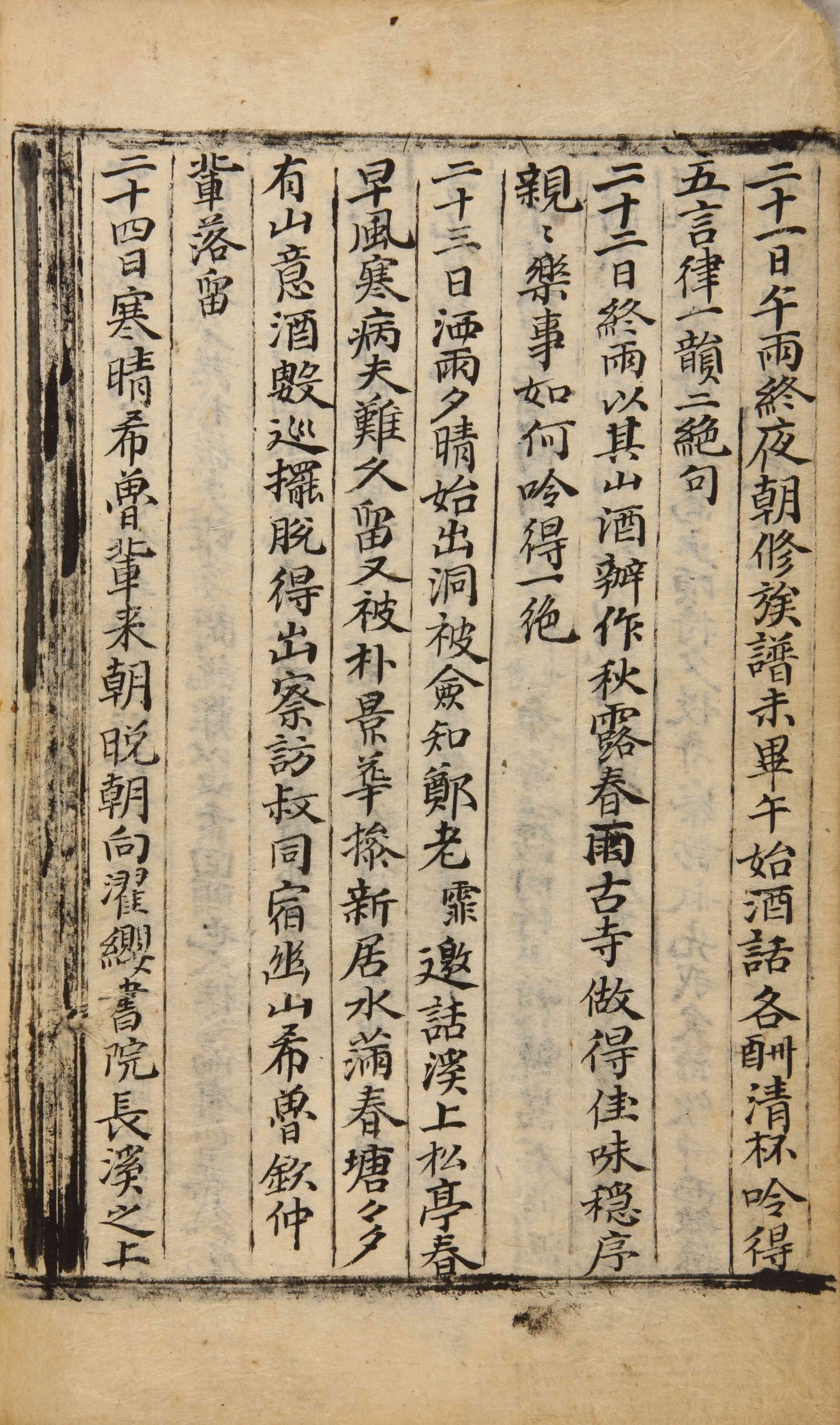아침에 족보(族譜)를 고쳤는데 마치지는 못했다. 낮에 비로소 술을 마시면서 이야기를 나누었다. 각각 술잔을 주고받으며 오언율시 한 수와 절구 두 수를 읊조렸다.