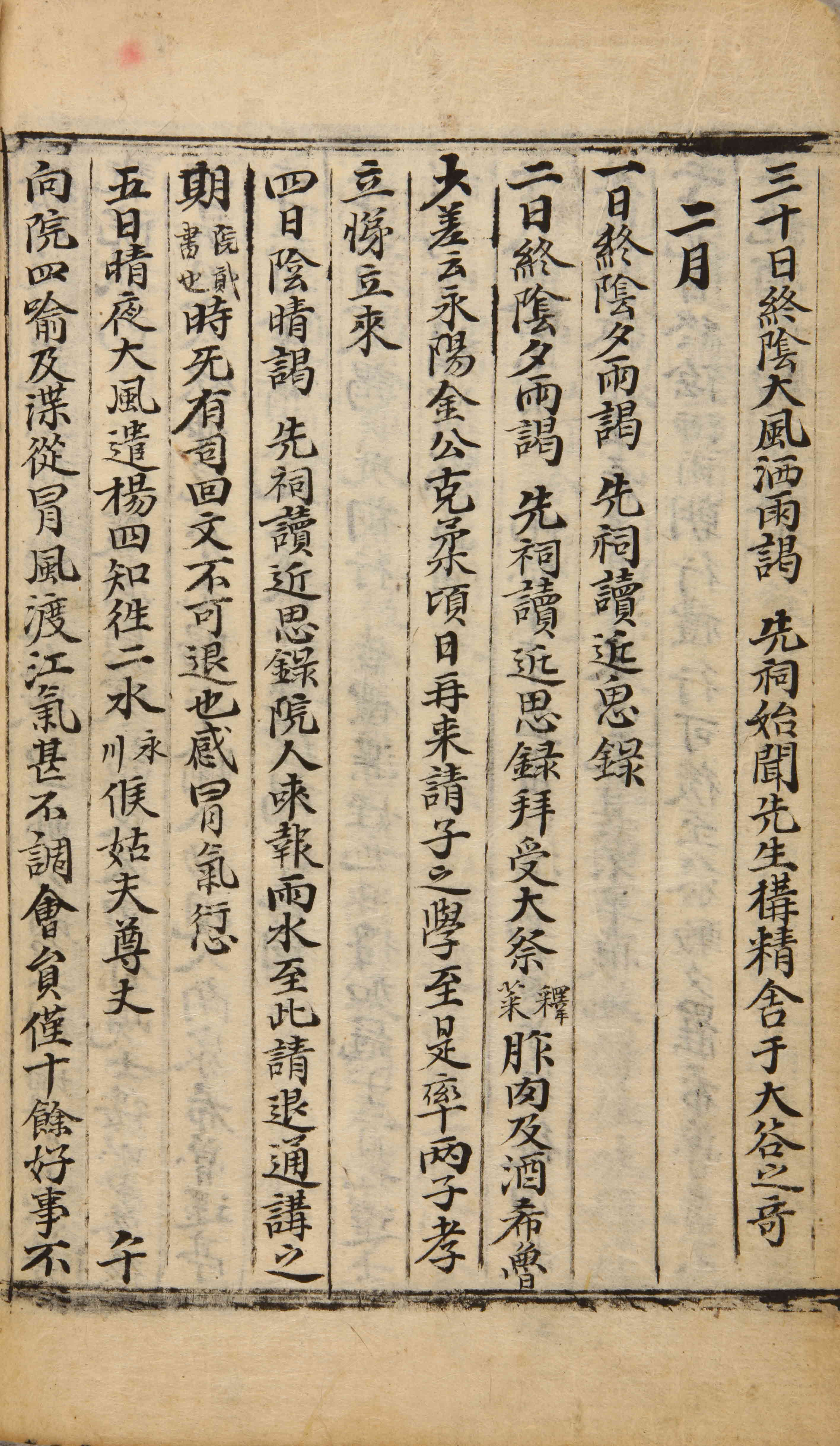 終陰夕雨。謁先祠。讀近思錄。拜受大祭【釋菜】胙肉及酒。希魯少差云。永陽金公克柔頃日再來。請子之學。至是率兩子孝立悌立來。