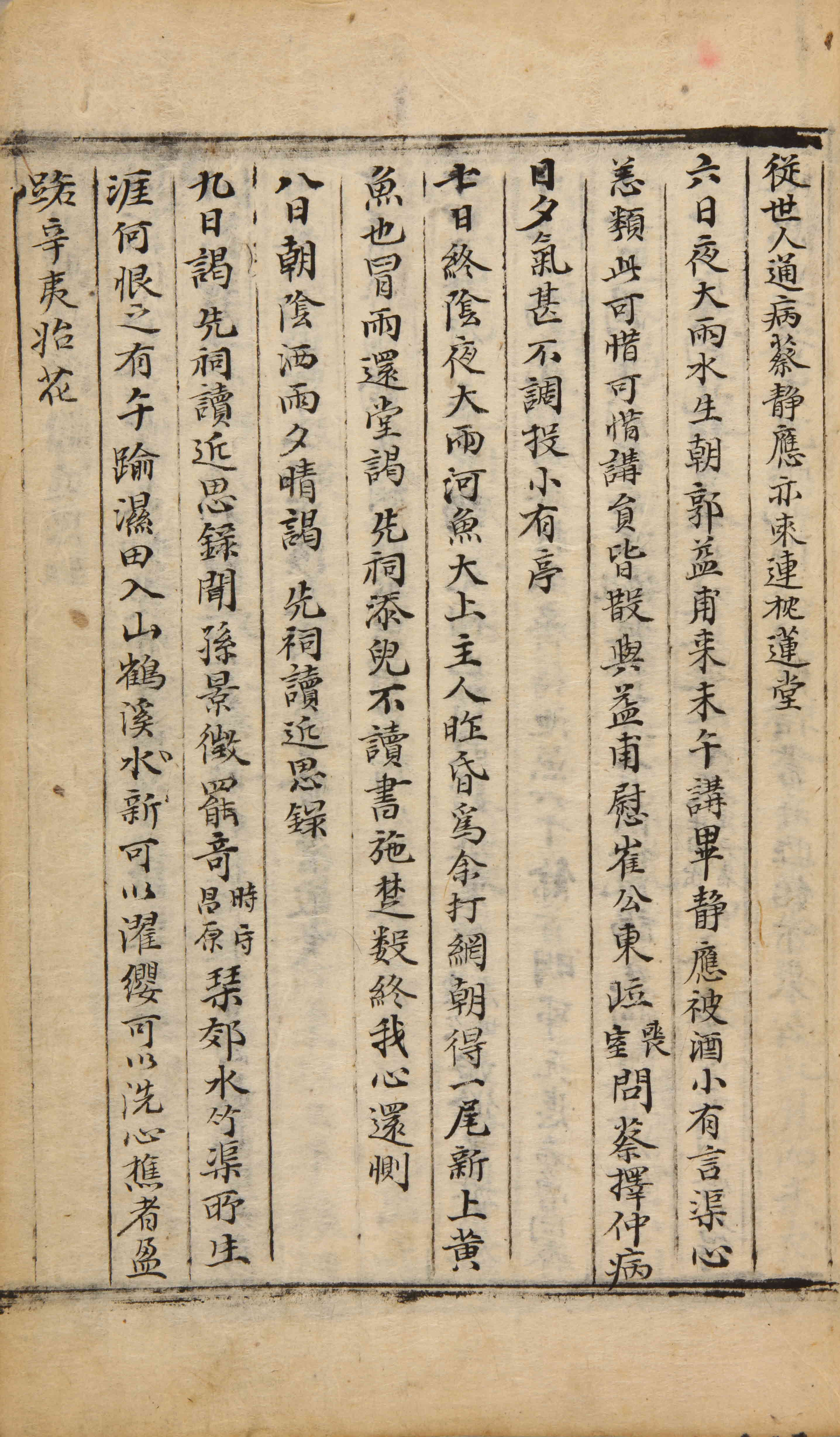 夜大雨水生。朝郭益甫來。未午講畢。靜應被酒小有言。渠心恙類。此可惜可惜。講員皆散。與益甫慰崔公東岦【喪室】問蔡擇仲病。日夕氣甚不調。投小有亭。