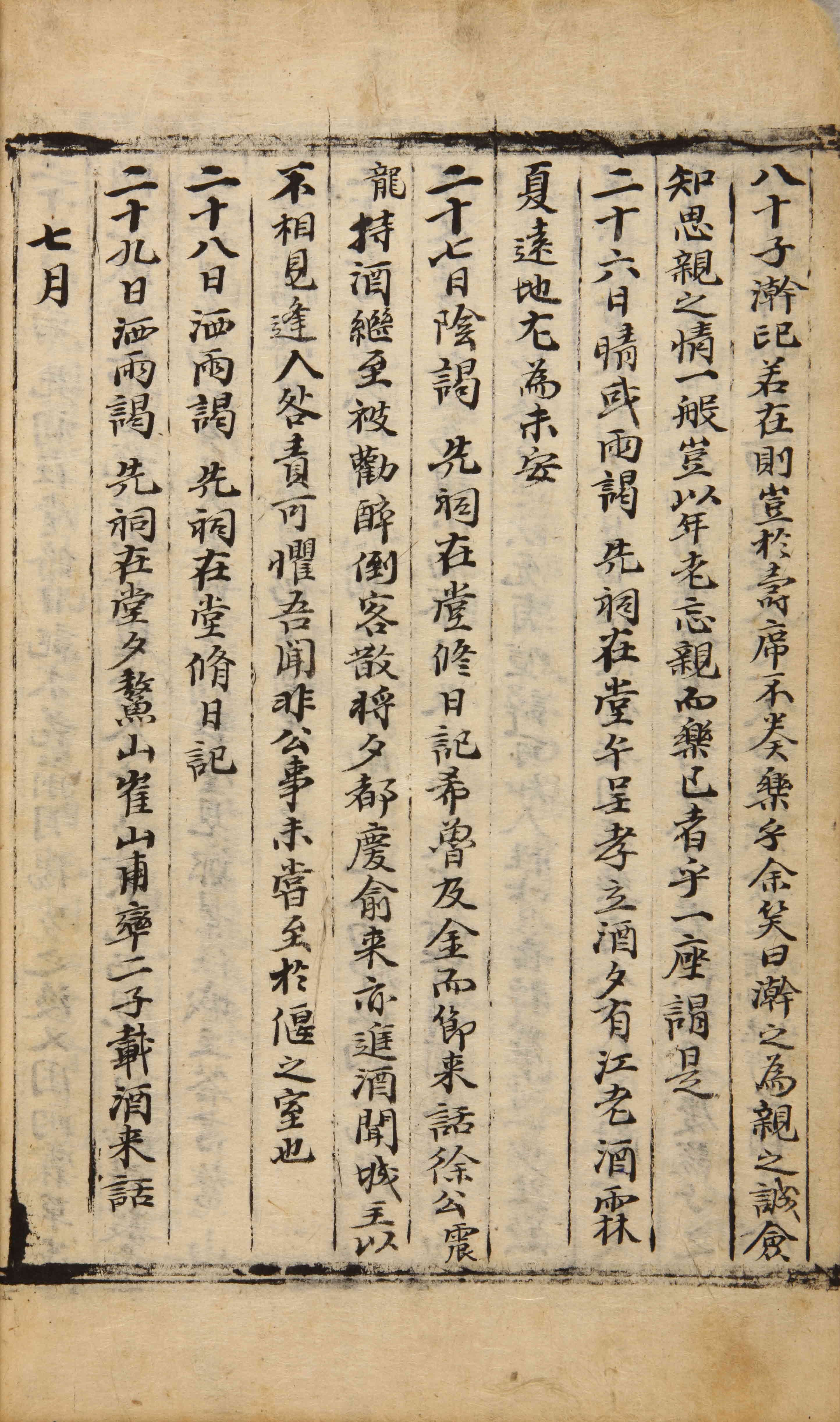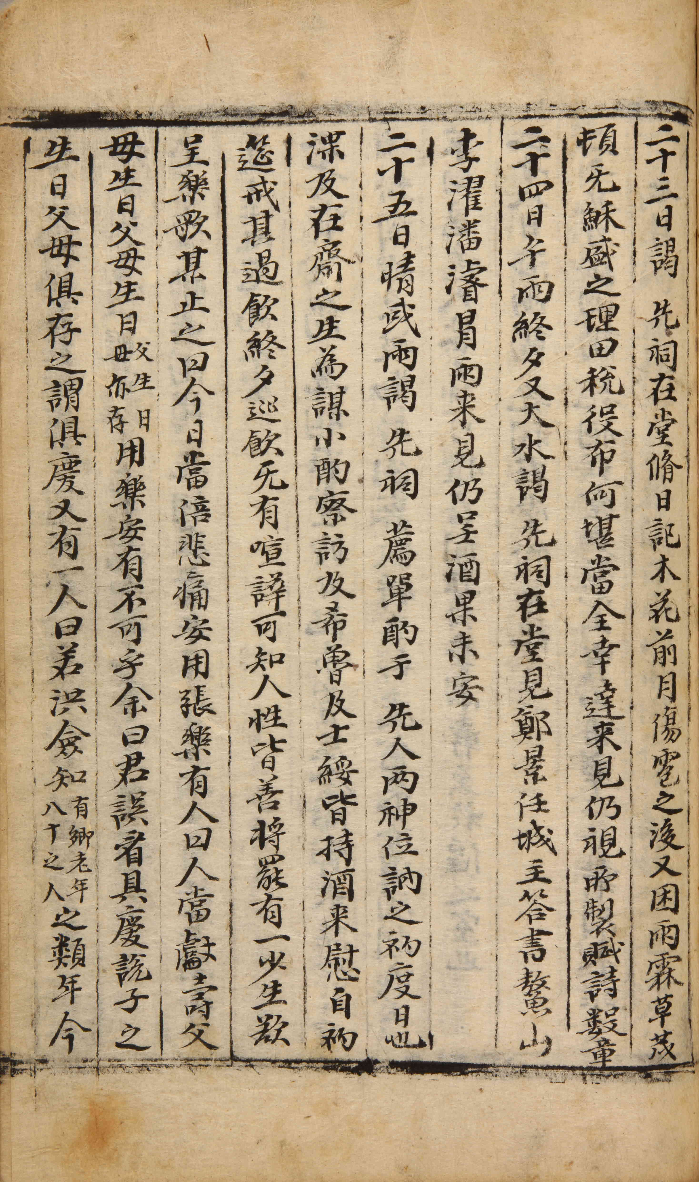 晴或雨。謁先祠。薦單酌于先人兩神位。訥之初度日也。渫及在齋之生。爲謀小酌。察訪及希魯及士綏。皆持酒來慰。自初筵戒其過飮。終夕巡飮。無有喧譁。可知人性皆善。將罷有一少生欲呈樂歌。某止之曰。今日當倍悲痛。安用張樂。有人曰。人當獻壽父母生日。父母生日【父生日。母亦存。】用樂。安有不可乎。余曰。君誤看具慶說。子之生日。父母俱存之謂俱慶。又有一人曰。若洪僉知【有鄕老。年八十之人。】之類。年今八十。子澣死。若在則豈於壽席。不奏樂乎。余笑曰。澣之爲親之誠。僉知思親之情一般。豈以年老。忘親而樂已者乎。一座謂是。