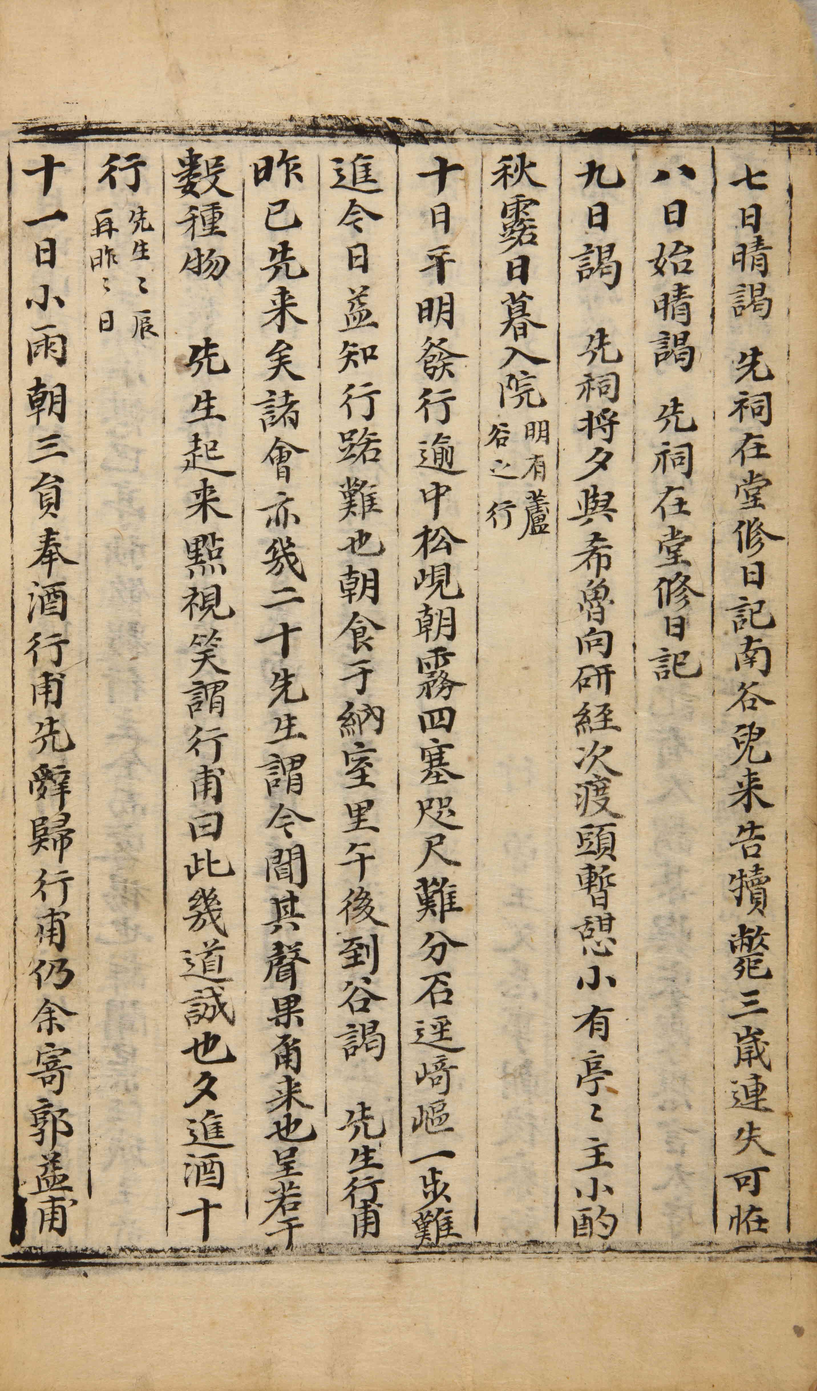小雨。朝三員奉酒。行甫先辭歸。行甫仍余寄郭益甫。三律詠蓮賞等詩也。成說念後蓮池之約。聞行甫醉臥中路之奇。先生將欲往觀。有傳已行止。張正甫亦來。朝後十員奉酒。先生竟夕不醉。訥爲而直叔發所侑。醉臥不省。