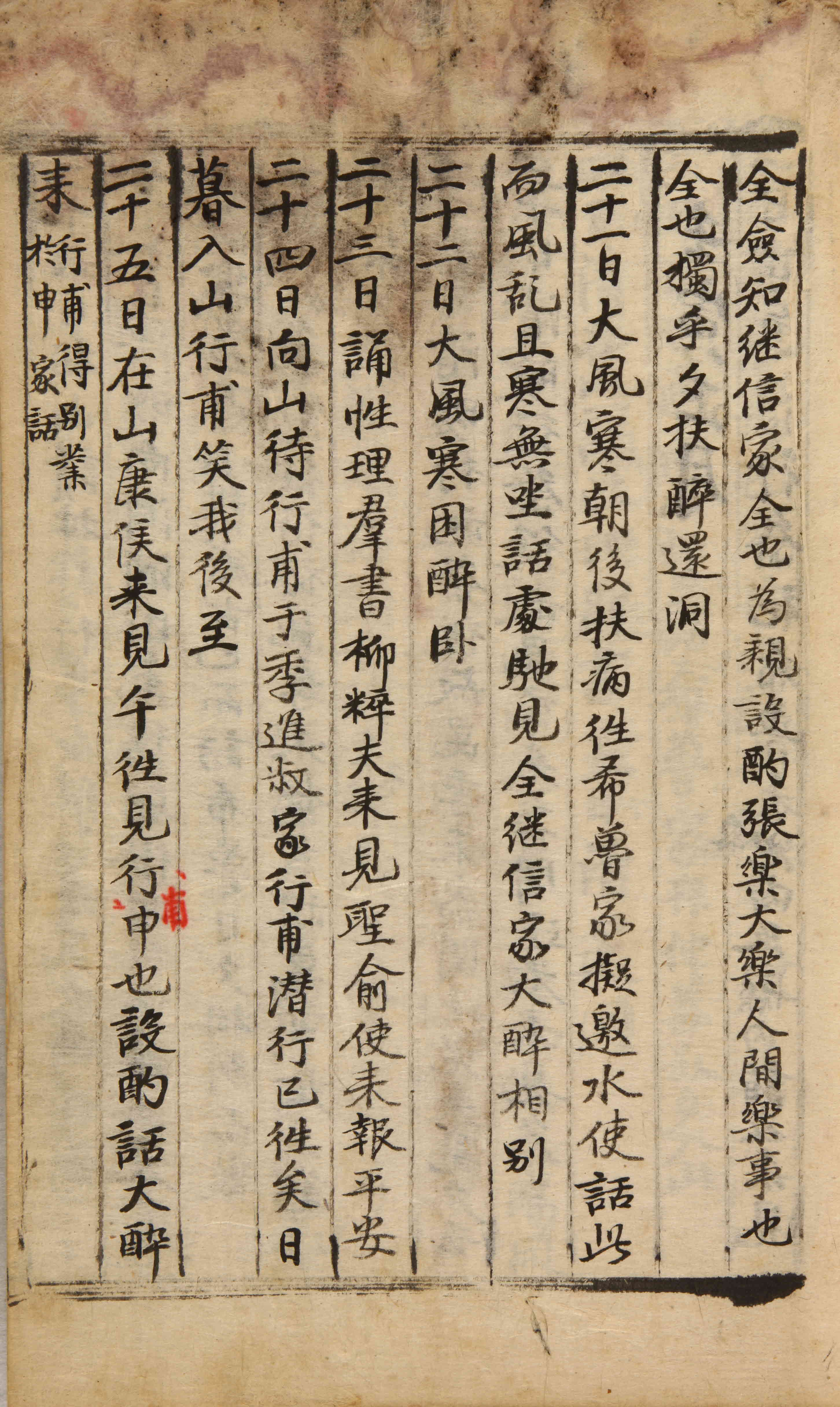 大風寒。向洞。■路遇申萬戶及全叔勤。邀入全僉知繼信家。全也爲親設酌。張樂大樂。人間樂事也。全也獨乎。夕扶醉還洞。