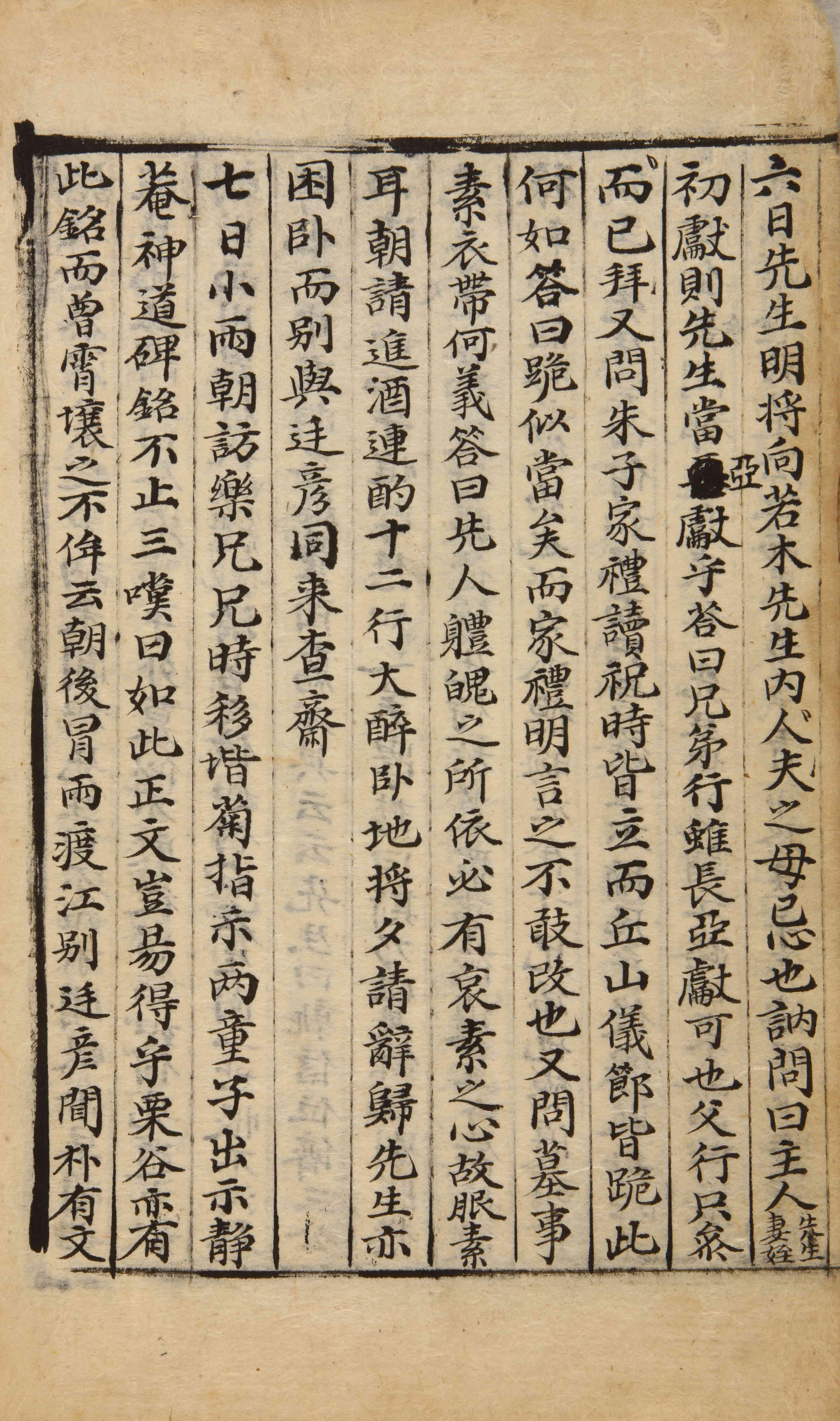 先生明將向若木。先生內夫人之母忌也。訥問曰。主人【先生妻姪】初獻。則先生當亞獻乎。答曰。兄弟行。雖長亞獻可也。父行。只參拜而已。問朱子家禮讀祝時皆立。而丘山儀節皆跪。此何如。答曰。跪似當矣。而家禮明言之。不敢改也。又問墓事。素衣帶何義。答曰。先人體魄之所依。必有哀素之心。故服素耳。朝請進酒。連酌十二行。大醉臥地。將夕請辭歸。先生亦困臥而別。與廷彦同來査齋。
