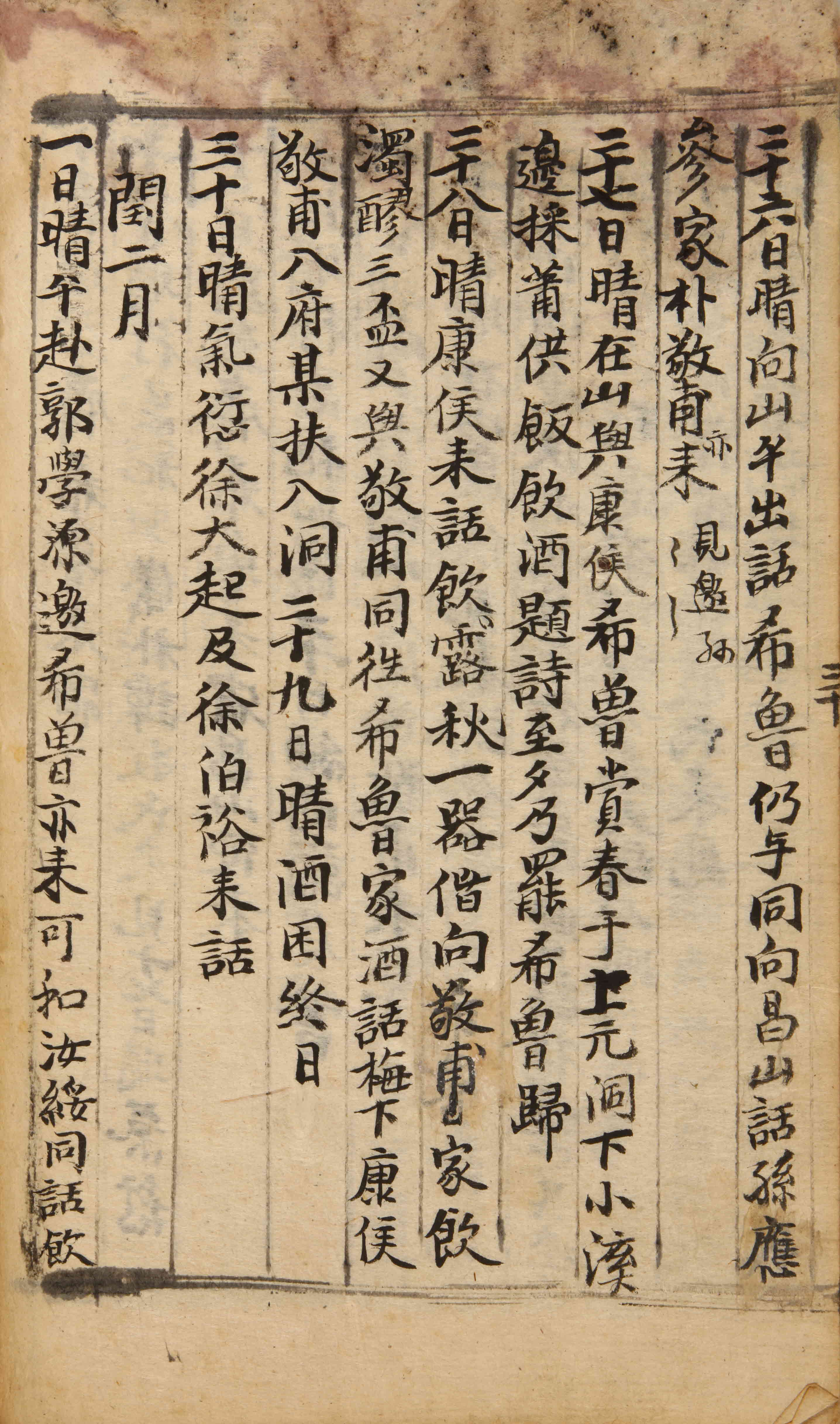 강후(康侯)[최흥국(崔興國)]가 와서 이야기를 나누고, 추로주(秋露酒) 한 그릇을 마셨다. 함께 경보(敬甫)[박유헌(朴惟憲)]의 집으로 가서 탁주 3잔을 마셨다. 또 경보와 함께 희로(希魯)[손처약(孫處約)]의 집으로 가서 매화 아래에서 술을 마시고 이야기를 나누었다. 강후와 경보가 부(府)로 들어갔다. 나는 취한 몸을 이끌고 동(洞)으로 갔다.