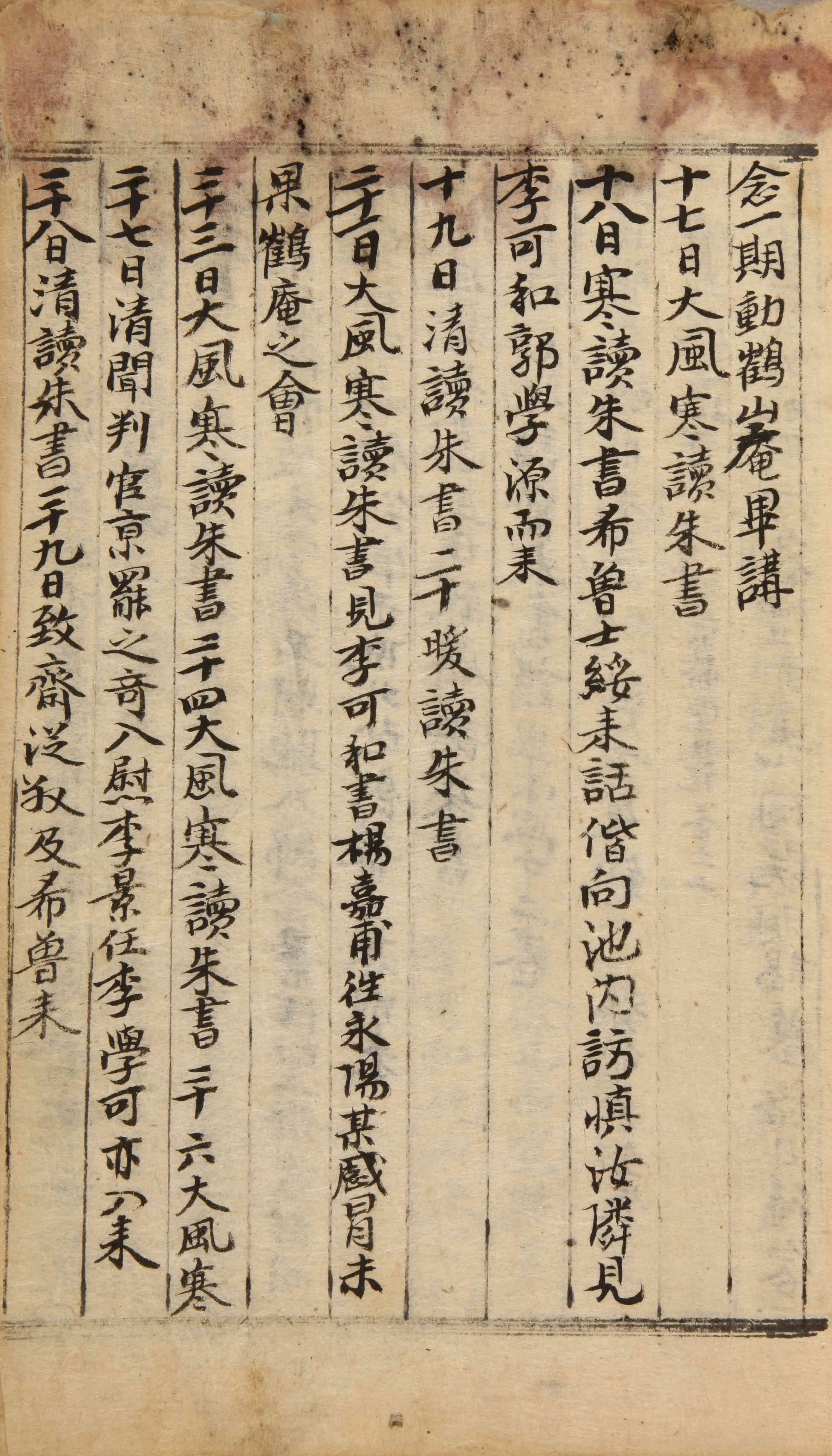 『주서(朱書)』를 읽었다. 희로(希魯)[손처약(孫處約)]와 사유(士綏)[이응기(李應褀)]가 와서 이야기를 나누고, 함께 지내(池內)로 향했다. 신여린(愼汝隣)을 방문하여 이가화(李可和)[이경배(李景培)]와 곽학원(郭學源)[곽렴(郭濂)]을 만나고 왔다.