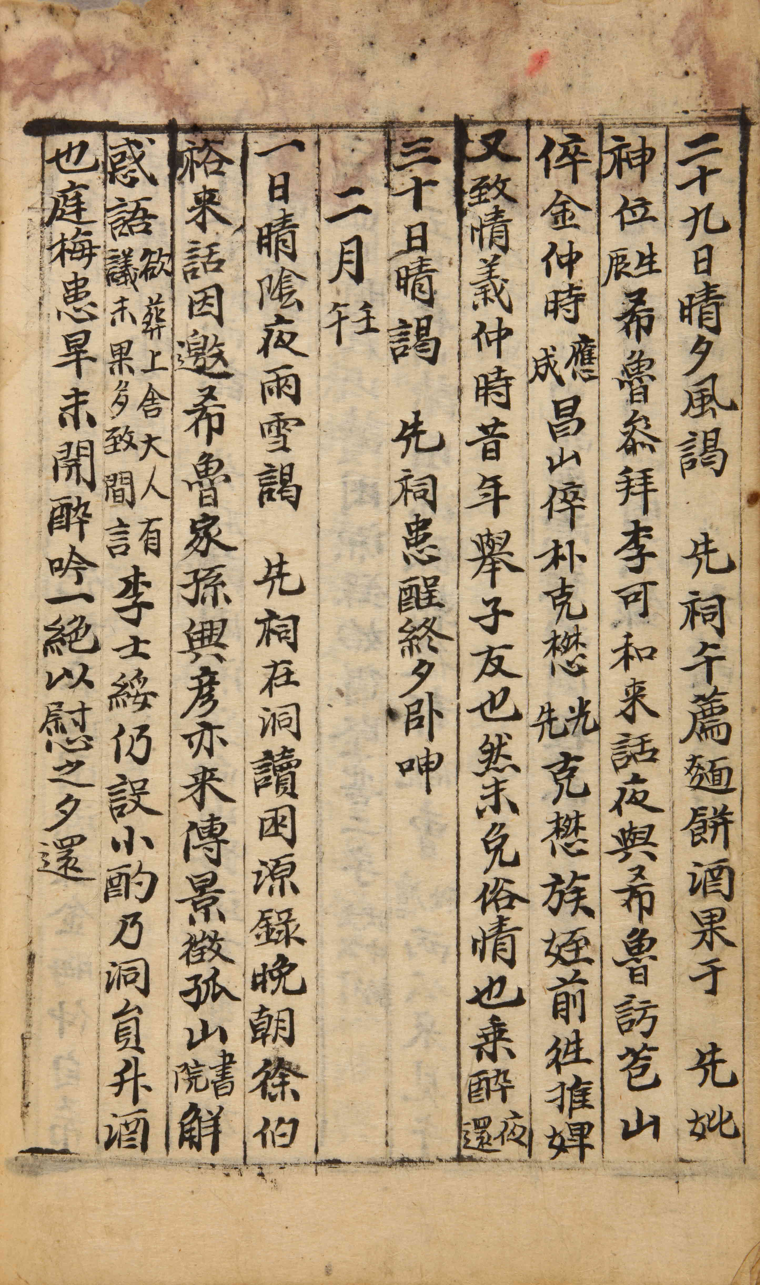 晴。夕風。謁先祠。午薦麵餠酒果于先妣神位。【生辰。】希魯參拜。李可和來話。夜與希魯。訪苞山倅金仲時【應成。】。昌山倅朴克懋【光先。】。克懋族姪。前往推婢。又致情義。仲時。昔年擧子友也。然未免俗情也。乘醉夜還。