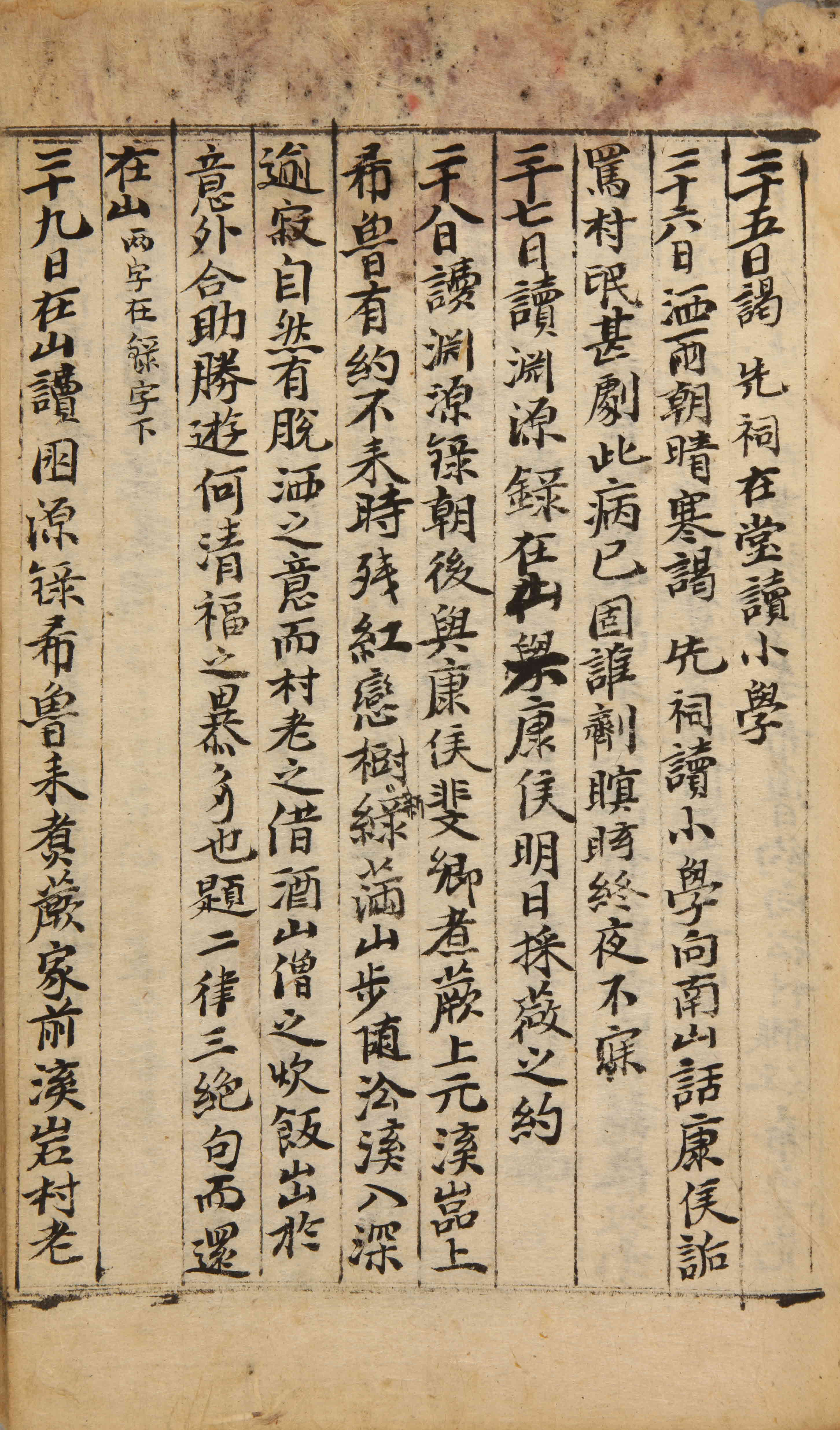 『이락연원록(伊洛淵源錄)』을 읽었다. 아침을 먹은 뒤에 강후(康侯)[최흥국(崔興國)], 비경(斐卿)과 함께 상원(上元) 시냇가 바위 위에서 고사리를 삶아 먹었다. 희로(希魯)[손처약(孫處約)]는 약속을 해놓고 오지 않았다. 이때 지고 남은 꽃은 제 가지를 그리워하고 신록(新綠)은 산에 가득했다. 시내를 따라 걸어가니 깊이 들어갈수록 더욱 적막하여 자연스럽게 씻은 듯 세속을 벗어난 기운이 있었다. 그리고 촌노(村老)가 술을 빌려주고, 산승(山僧)이 밥을 짓는 것은 생각지도 못한 데에서 나와 승경을 유람하는 데 적합했으니, 어찌 유유자적한 행복이 갑자기 쏟아지는가. 율시 2수와 절구 3수를 짓고 돌아왔다. 산에 있었다.【‘재산(在山)’ 두 자는 ‘록(錄)’자 아래에 있어야 한다.】