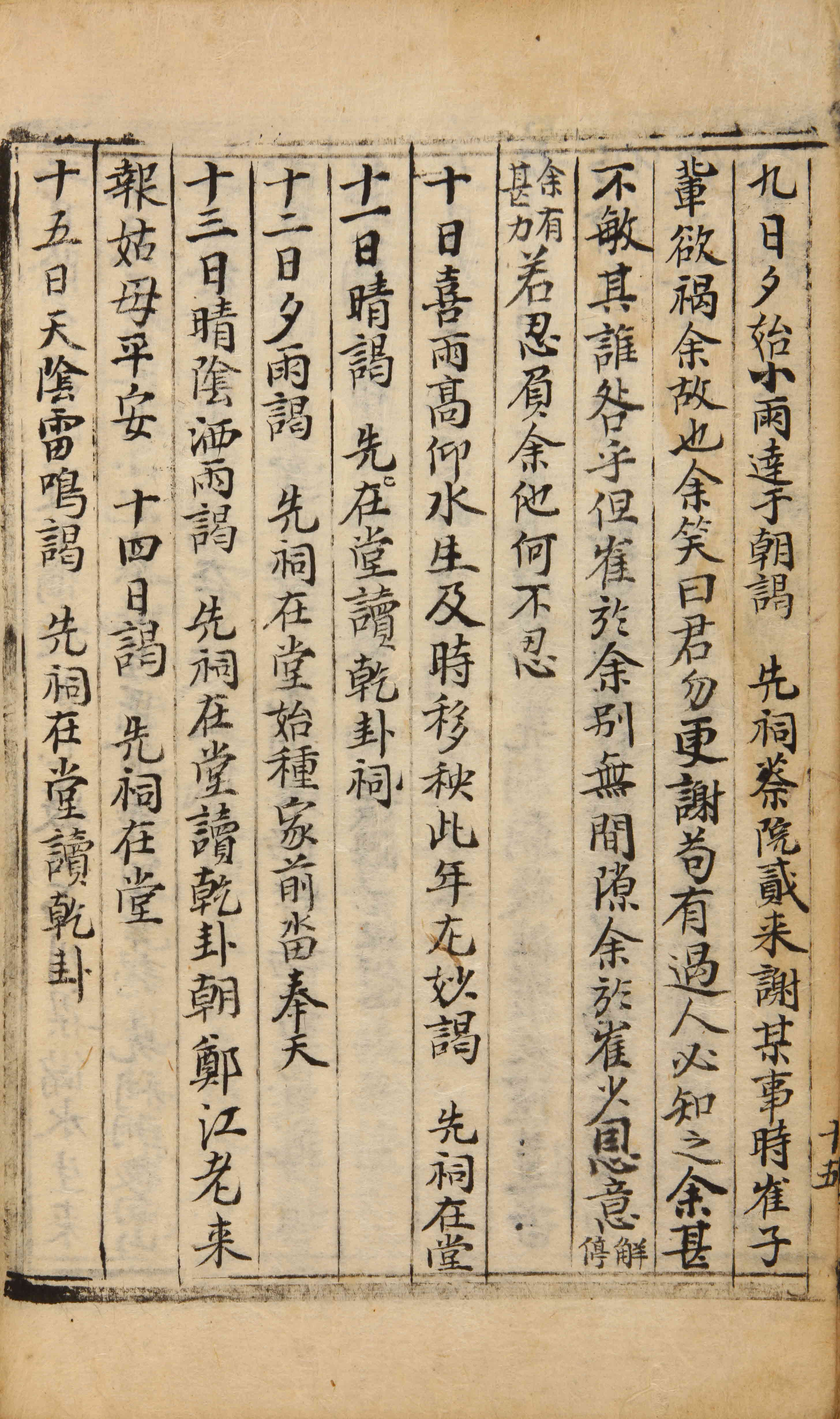 夕始小雨。達于朝。謁先祠。蔡院貳來謝某事。時崔子輩。欲禍余故也。余笑曰。君勿更謝。苟有過。人必知之。余甚不敏。其誰咎乎。但崔於余。別無間隙。余於崔。少恩意。【解停。余有甚力。】若忍負余。他何不忍。