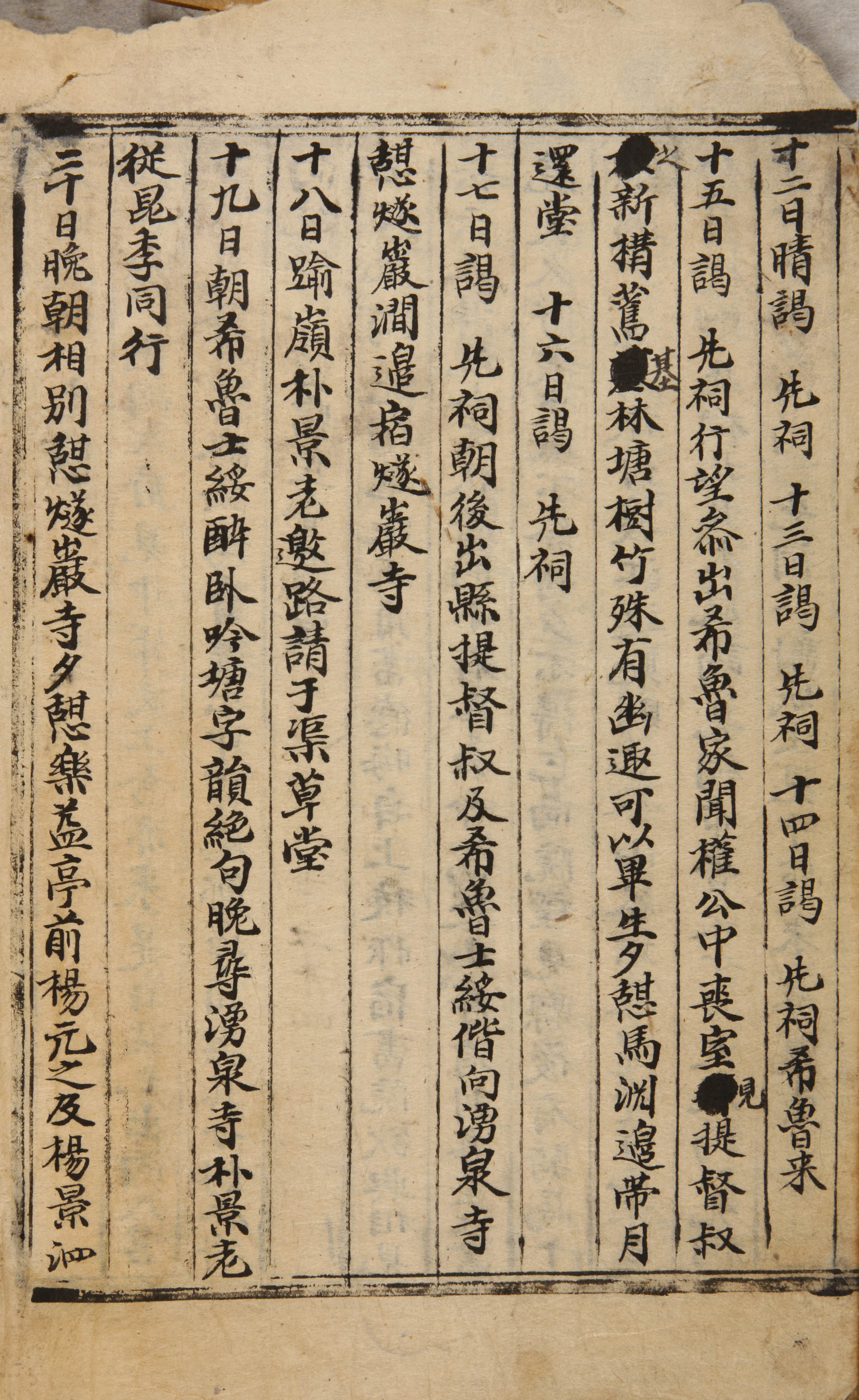 선사(先祠)에 배알하고 망참례(望參禮)를 행했다. 희로(希魯)[손처약(孫處約)]집에서 나와 권공(權公)이 아내 상을 당했다고 한다. 제독숙(提督叔)의 새 집을 보았다. 옛 터의 임당(林塘) 수죽(樹竹)이 매우 그윽한 정취가 있어 (그곳에서) 생을 마칠 만 했다. 저녁에 마연(馬淵) 가에서 쉬다가 달과 함께 당으로 돌아왔다.
