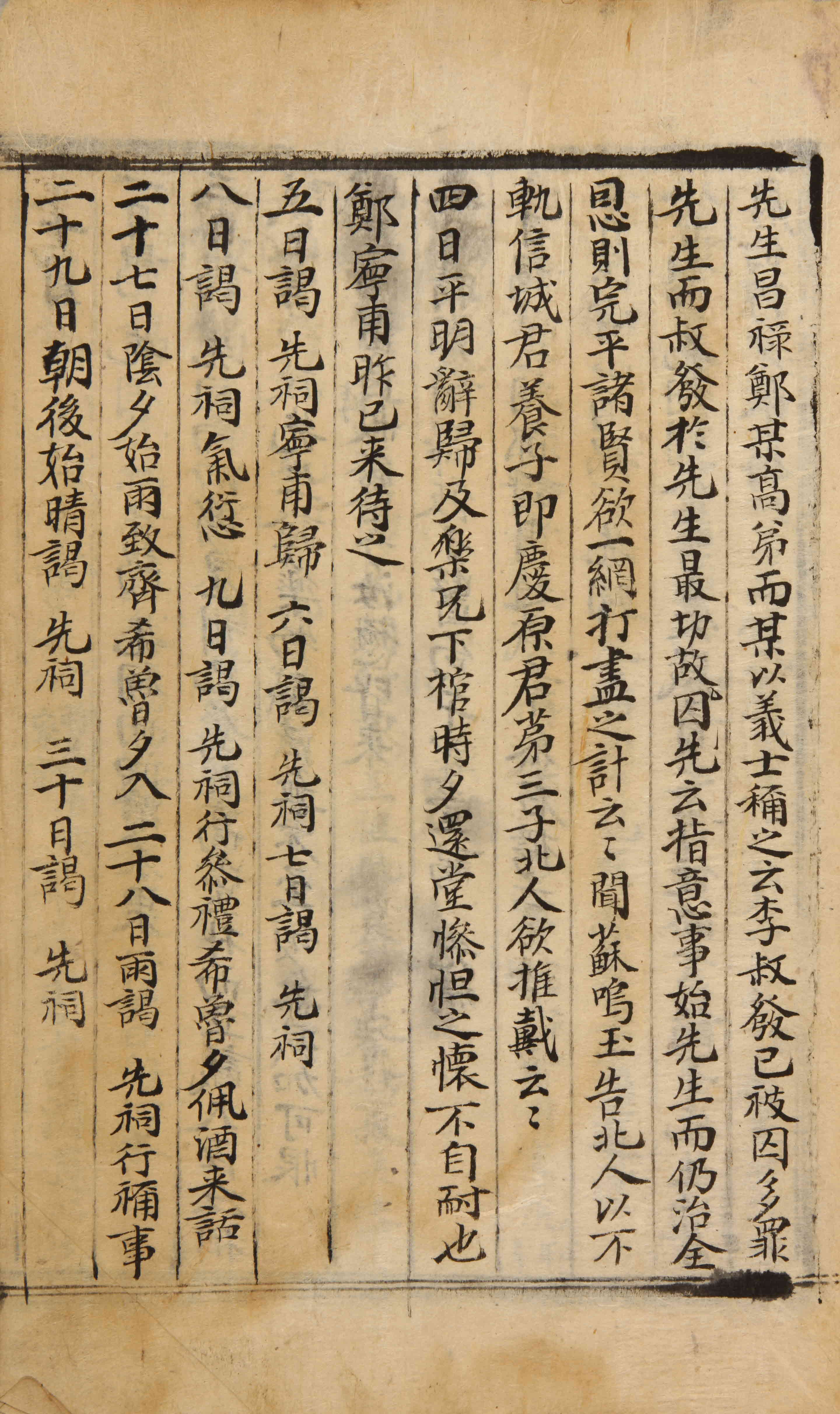 大風。謁先祠。氣愆。扶病哭奠樂兄柩前。將發引。夕拜先生于泗濱。時李汝懋來侍。是日先生自爲上章。李以直等未入。朴以立疏中。儒亦上疏。前月念五。朴以立李昌祿事上疏。監司不受。欲上京云。故監司不得已馳上疏。中言全指先生昌祿鄭某高弟。而某以義士稱之云。李叔發已被囚。多罪先生。而叔發於先生最切。故先囚云。指意事始先生。而仍治全恩。則完平諸賢。欲一網打盡之計云云。聞蘇嗚玉告北人以不軌。信城君養子。卽慶原君弟三子。北人欲推戴云云。