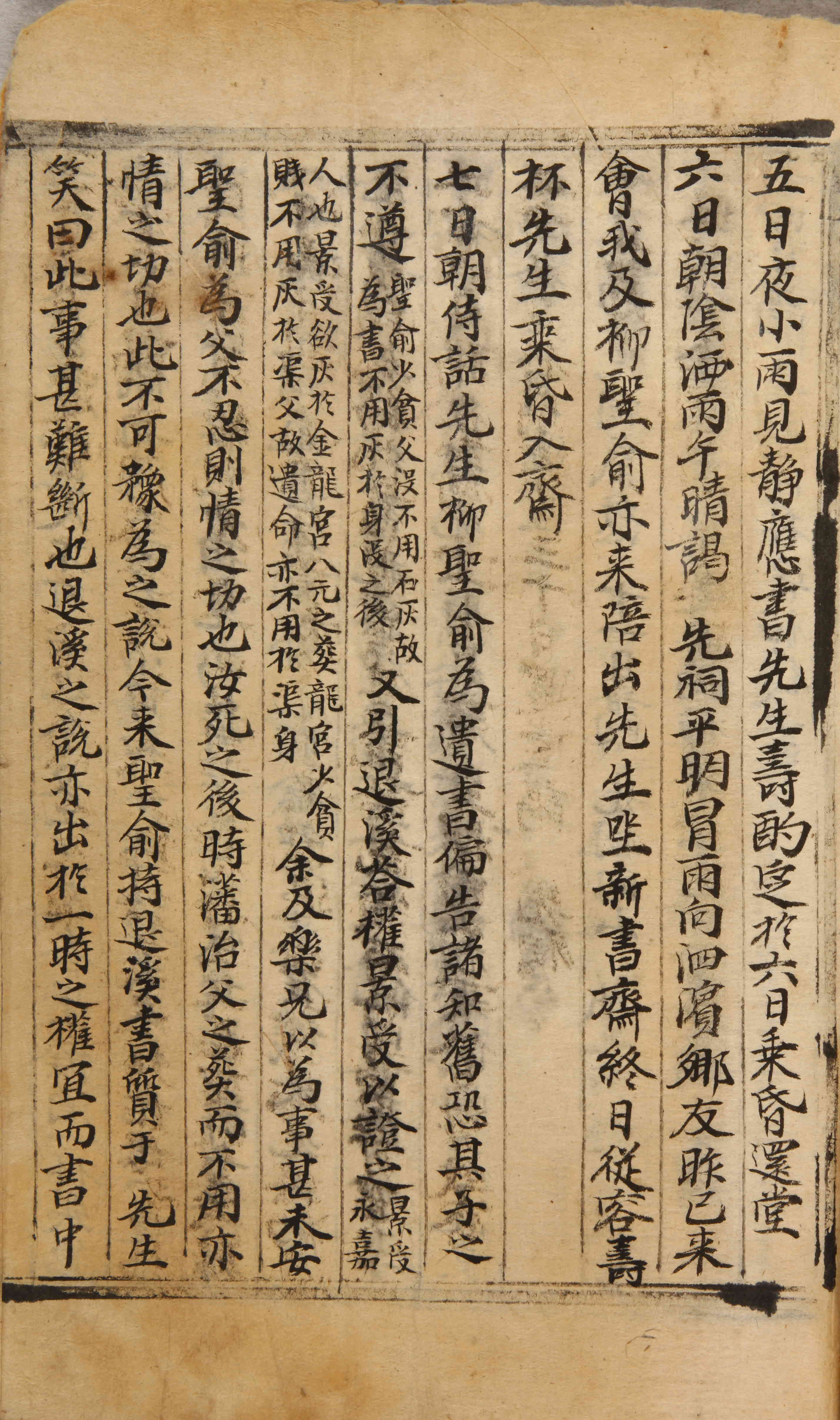 朝陰灑雨。午晴。謁先祠。平明冒雨向泗濱。鄕友昨已來會。我及柳聖兪亦來。陪出先生。坐新書齋。終日從容壽杯先生。乘昏入齋。