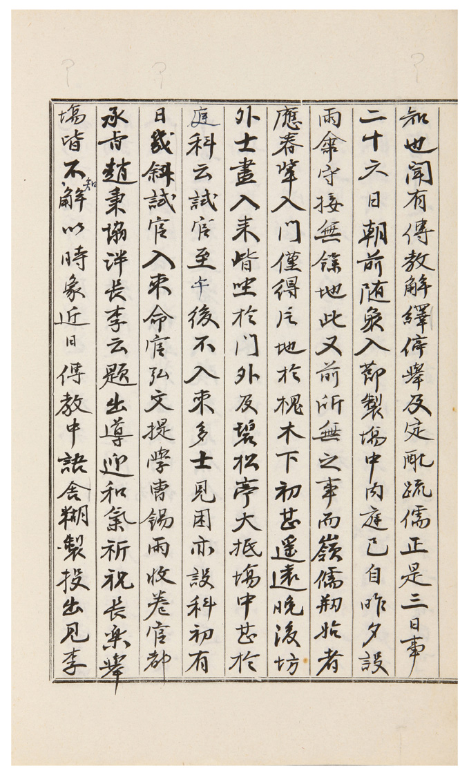 朝前隨衆。入節製場中。內庭已自昨夕設雨傘。守接無餘地。此又前所無之事。而嶺儒創始者。應春輩入門。僅得片地於槐木下。初甚遙遠。晩後坊外士盡入來。皆坐於門外及碧松亭。大抵場中甚於庭科云。試官至午後不入來。多士見困。亦設科初有。日幾斜。試官入來。命官弘文提學曺錫雨。收卷官都承旨趙秉協泮長李云。題出導迎和氣祈祝長樂。擧場皆不知解。以時象近日傳敎中語。含糊製投。出見李元振。近日借見太學所藏正廟文集。其中長樂歌。有此二句。渠則知解早呈云。可有望耶。盖正廟祝慈殿。而慈殿所居宮名爲長樂。故近日東朝傳敎。有導迎歸福之祝。故今日題爲報答云耳。士子則盡入於場中。泮村朝士。又以伺間隙。散出坊外。從叔父終日不得見人。甚寂寞遣日云。伏笑。