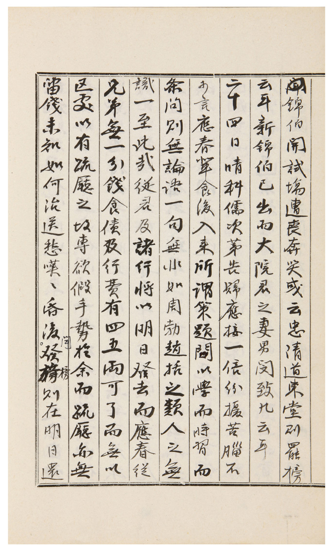 晴。早起入場。川上法興法田。皆通接而坐。題出間小學遇二首。而中有勝作之文。而未能的知。誰稿嫌於同人雷同。遂以東嵓遺草書呈。文甚古。而意味則甚裕如。然亦何關邪。一首則世有將書。而仲賢默坐。爲待余手餘暇。見甚悶。世有讓與無吝。爲換瞻兄手。精寫納券計。甚善處耳。余心服愛。急草中尾。未盡寫之。前搆出一頸。草以光世。有試紙。而出來先後好否。實無關耳。洪進士回人入來。兄書知無事得達。病勢亦不加劇。甚幸耳。一所題聞學而時習云。應春輩。似不過。未知何以了券也。在此。則應有三四首。不費困艱。每事不隨順。則終必有恨底出耳。嘆嘆。聞■(聞)錦伯開試場。遭喪奔哭。或云忠淸道。東堂則罷榜云耳。新錦伯已出。而大院君之妻男/閔致九云耳。