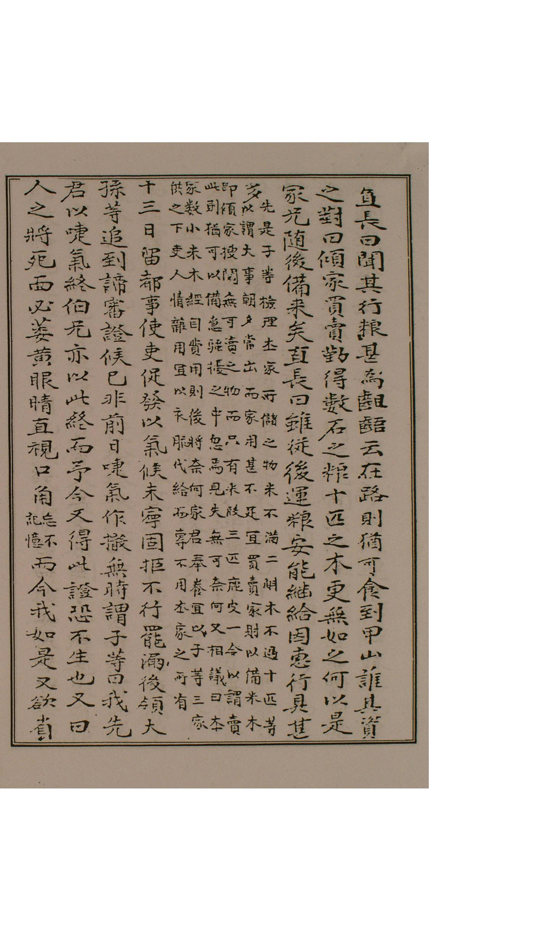 留。都事使吏促發。以氣候未寧。固拒不行。罷漏後。領大孫等追到。諦審證候。已非前日。啑氣作撤無時。謂子等曰。我先君以啑氣終。伯兄亦以此終。而予今又得此證。恐不生也。又曰。人之將死。面必萎黃。眼睛直視。口角【忘不記憶。】。而今我如是。又欲省古詩而無一句得。因微吟一句。而子等未及詳聽。【兄主曰。似是大同江水何時盡。別淚年年添淥波之句。未及詳聞。平生之大遺恨也。】子粹兄主及㝯奉扶。而兄主奉藥餌勸進。家君曰。予今則證勢似弛。故欲嘗食味。汝等强勸苦藥何耶。兄主曰。證雖小弛。藥不可緩也。乃嘗之。連從自京來。【素知之人。】猝入而進曰。昨日兩司七啓。而皆不允云。【此人喜其不允之意而告之也。】家君曰。臺諫論啓。一日不過三四度。而今至七啓。則我事必不止。【家君自在京時。雖聞論啓之言。子等以停啓告之。至是復知之而甚疑惑。】子等對曰。連從謬聽而妄達。勿以爲慮。答曰。爾等終始隱諱。我愈疑懼。百般諫喩。終不解。夕廳事寒凉。移寢于房中。自是以後。言語始澁。氣息益急。沈綿不省。子等問證候何如。答曰。左膝甚冷。宜厚覆之。子等以手捫之。別無寒冷。以衣加覆之。且以溫手拊之。連進淸心蘇合元。曾無其效。家君曰。都事來耶。闕庭之問然乎。【疑是虛言也。】子等對曰。臺諫論啓。連從之妄言。豈有都事之來闕庭之問乎。勿以爲慮。曰。若來則爾將何爲。兩司連啓。皆不允。