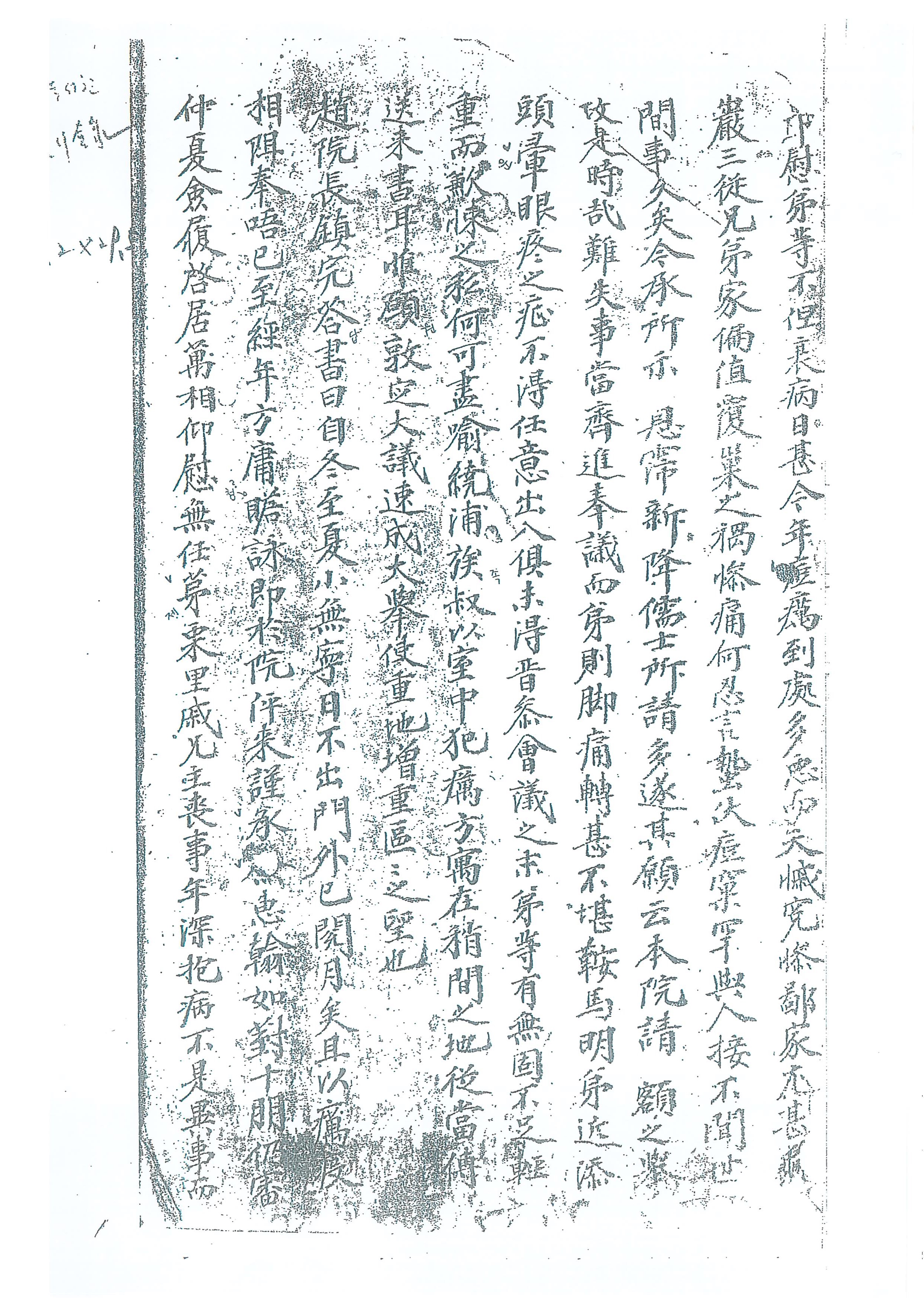 仰慰。弟等。不但衰病日甚。今年痘癘。到處多惡。而夭慽寃慘。鄙家尤甚。龜巖三從兄弟家。偏値覆巢之禍。慘痛何忍言。蟄伏痘窠。罕與人接。不聞世間事。久矣。今承所示。恩霈新降。儒士所請。多遂其願云。本院請額之擧。政是時哉難失。事當齊進奉議。而弟則脚痛轉甚。不堪鞍馬。明弟。近添頭暈眼疼之症。不得任意出入。俱未得晋參會議之末。弟等有無。固不足輕重。而歉悚之私。何可盡喩。繞浦族叔。以室中犯癘。方寓在稍間之地。從當傳送來書耳。惟願敦定大議。速成大擧。使重地增重。區區之望也。 趙院長鎭完。答書曰。自冬至夏。小無寧日。不出門外。已閱月矣。且以癘疫相阻。奉唔已至經年。方庸瞻詠。卽於院伻來。謹承僉惠翰。如對十朋。仍審仲夏。僉履啓居萬相。仰慰無任。第栗里戚兄主喪事。年深抱病。不是異事。而其人可惜。痛悼何言。聞士剛兄子婦。痘症已至出場。非徒其家之慶。知舊之心。欣喜十分。弟。老病轉深。全廢人事。久矣。出入一節。不可論。且昨聞訥村孫婿之凶音。慘愕。情緖尤無以爲喩。示玉院請額事。朝家旣有廣施之典。則此院不可無士林請額之行。而弟則以聞訃之後。了無世況。不得趍進面議。恨何如之 盧院長重文答書曰。久未承誨。方切瞻仰。不自意。伏承僉下札。謹伏審近者僉體履。震艮萬相。伏慰不任下悰。記下。依昨而門內慘喪。前後相繼。種種光景。實今人難耐。奈何奈何。玉洞之尙未蒙額。實是聖世欠典。吾鄕儒林之慨恨。久矣。今有朝家廣施之典。則此誠不可失之好機會也。承知盛籌已定。何幸何幸。明日來汝之敎。敢不惟命。第所騎猝難借得。再明曉頭。當進拜於玉院。恭聽緖論。而恐或有後事之悔。幸以下諒是望 道谷書堂答通。本院請額之擧。至今未遑者。士林之所共慨歎也。今承盛諭。敢不齊聲以從。玆以鄙堂名帖修呈。考覽幸甚。有司。趙。李 魯東書堂答通。玉院請額事。實是斯文盛擧。士林之幸。當復如何。本堂名帖。依敎書呈。考納幸甚。有司。全。 頴濱書堂答通。貴院請額之擧。實是吾鄕大事。而迄今遷就。士林之慨然者。久矣。卽承來諭。豈非斯文之幸。卽名帖依敎收呈。諒悉幸甚。有司。權。李。 首陽書堂答通。貴院請額之擧。際此湖嶺間。蒙允之下。實是士林之幸。本堂名帖。依示收送。諒悉幸甚。山長。韓。 竹林書堂答通。貴院請額之擧。前此吾鄕未遑之典。僉尊首發大論。有此輪示。其在共尊之義。敢不齊聲而應之哉。玆收名帖。依敎謹呈。諒悉幸甚。山長。洪。有司。南。柳。 智川書堂答通。貴院請額之擧。實是斯文之幸。孰不樂赴於齊會之日。卽儒生名帖。先爲錄呈。考察幸甚。山長。康。有司。康。 松巖書堂答通。伏以貴院方營大擧。士林之攢慶。爲如何哉。鄙堂當定儒生往參。而各汨喪慽。只以名帖修送。照察幸甚。有司。金。 鳳巖書堂答通。遺失未謄。 首善書堂答通。遺失未謄。 龍門書堂答通。遺失未謄。 石門書堂答通。遺失未謄。 梅嶽書堂答通。遺失未謄。 孤峯書堂答通。遺失未謄。 十四書堂名帖。次第來到。安平瀰川壽峰。黃氏老少數十。入齊會于本院。敦定大事。料理行資。而本院無見存之物。黃院長瑞熙。躬往新川黃碩休家。貸百緡銅。僅備行具。而無可送之人。本孫中。定黃院長聖休。士林中。定盧院長重文。是日孫院長益顯。參院會。盧院長。以本家癘氣上犯。書謝不赴。會中議定。趙斯文虎然。鄭斯文宗魯。而鄭斯文以未痘。不可犯危。趙斯文所居。稍間其無病故。又未可知曠日持久之際。恐或有後時之慮。以本面趙斯文奎鎭。單望特定。趙斯文。遂決意許行。是日葛田趙氏。諸入來會。黃進士景幹。以爲自此治疏行。則本院力勢。實難堪勝。入京後。與厖村本孫黃參判昇源。黃監察瑗。相議觀時審勢然後。始設疏廳。若其疏任。則館學齋儒中。必多嶺士。可以薦出云云。咸曰。諾。於是。修正四先生實記。及奉安文字。貰二馬。二十七日治發。黃弼熙。以本院齋任。從行。臨發。黃院長瑞熙建中。遠將于新安柳下而戒之曰。値此炎程。愼攝行李。且曰。凡事不可求可求成。到京所見。不如所聞。而齟齬難合。則勿以虛費院財。爲念決意勇退。申申面諭。一行咸曰。唯唯。黃宅坤。以管行隨去。 六月初九日。奴馬還來。黃監察瑗答書於黃氏宗中。畧曰。本院之尙未請額。實爲斯文之欠典。而恐或有非其時之慮。貞台之意亦然云云。盖非其時云者。以館學紛撓。此際封章。非其時之謂也。黃院長聖休。與諸族書曰。京中兩族人之意。以非時爲慮。而就質于蔡相濟恭。則以爲本院請額。亦已晩矣。如此疏章。有何非時之慮。勿爲下去。從速伏閤爲言。云云。