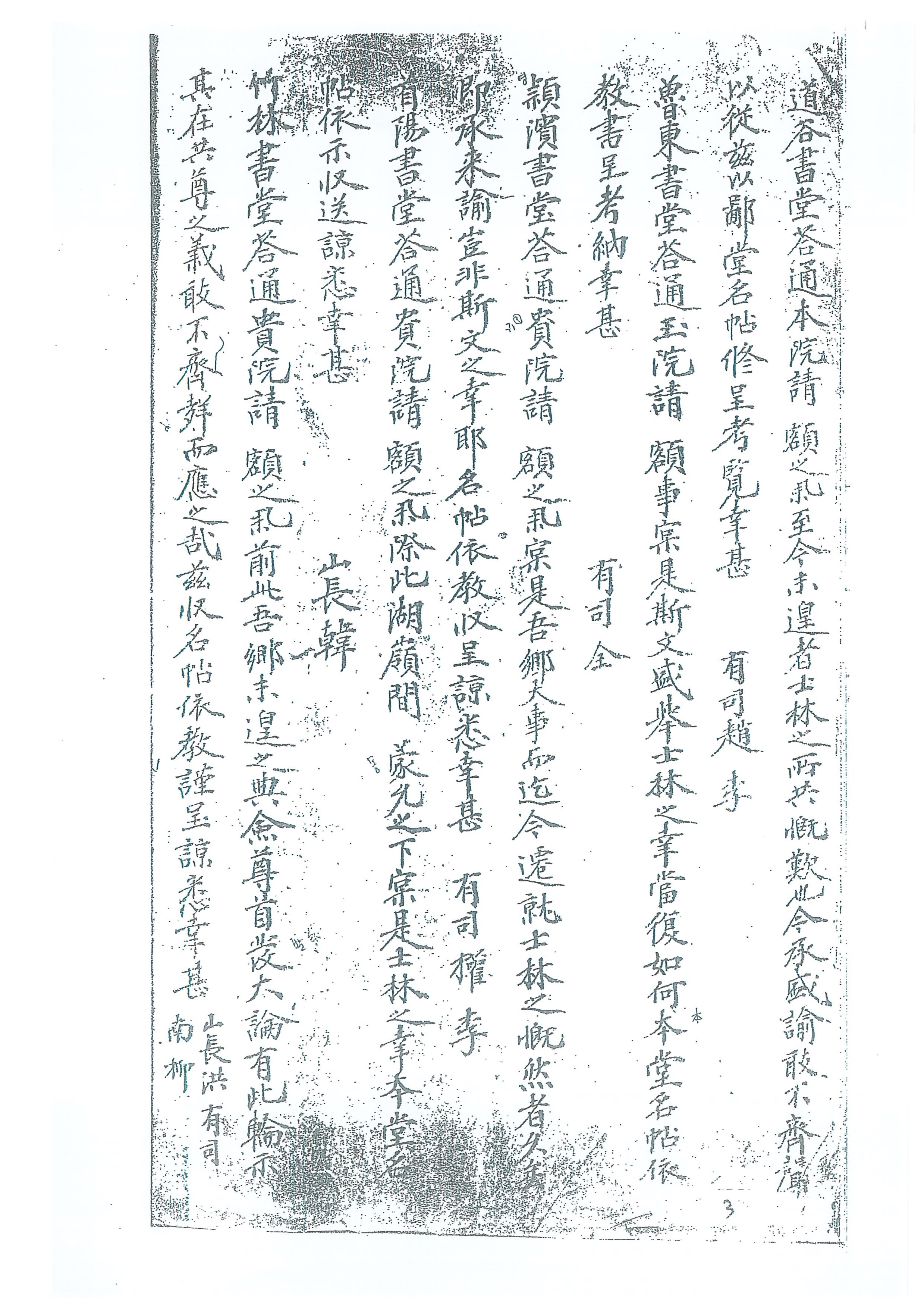 "貴院에서사액을청한일은이전에는우리고을에서겨를이없었던전례이었습니다.그런데여러분께서먼저큰의론을발하여이렇게두루보여주시니,함께따르는뜻에감히한목소리로응하지않겠습니까.이에이름을적은두루마리를거두어가르침에따라드리니양해해주시면참으로다행이겠습니다.