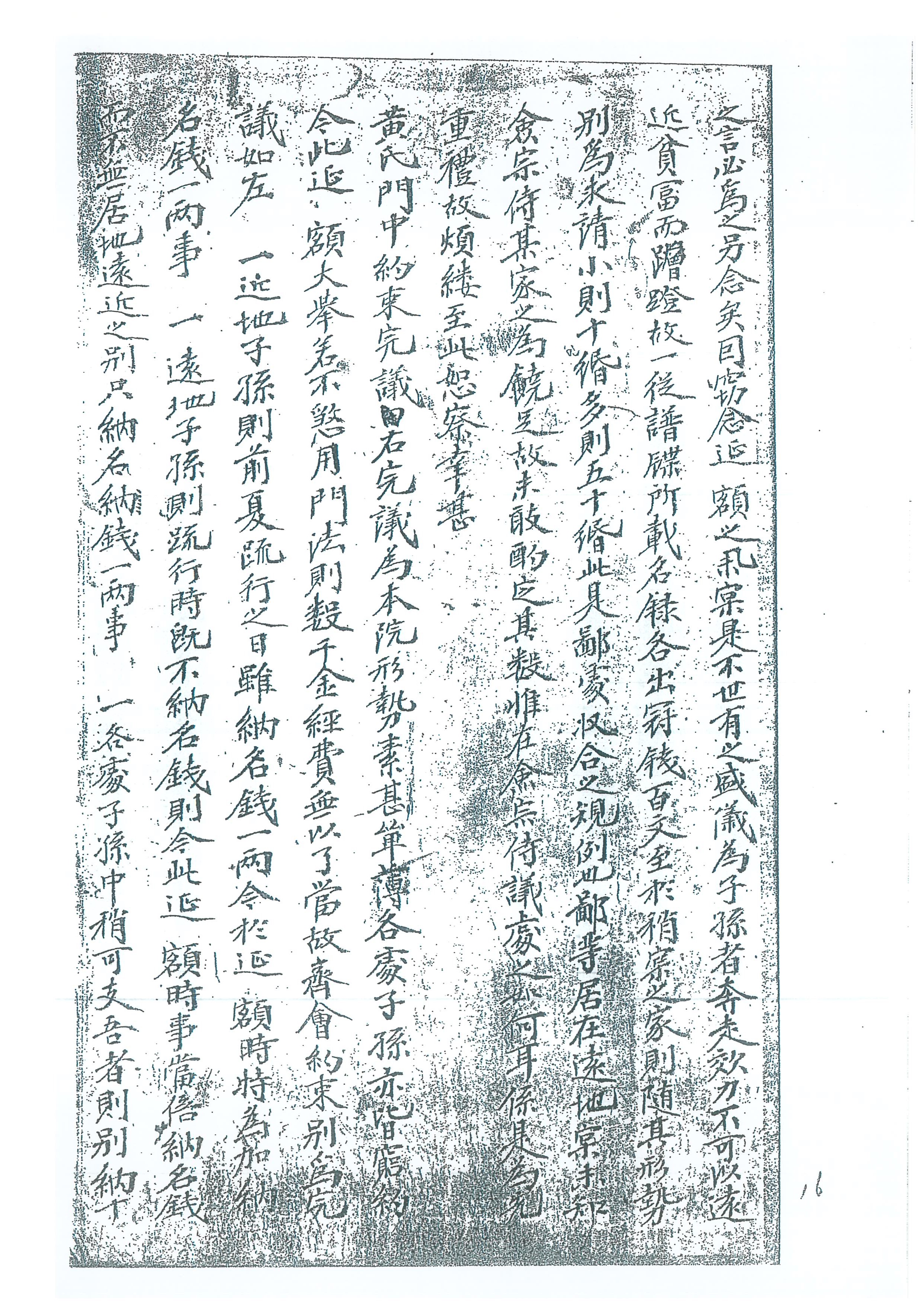 하나;멀리있는자손은상소를할때이미각자의돈을납부하지않았다면,지금편액을맞이할때의일에는마땅히각자의돈을배로납부해야한다.그러나멀고가까움의구별이없을수없으니단지각자는1냥만을납부할것