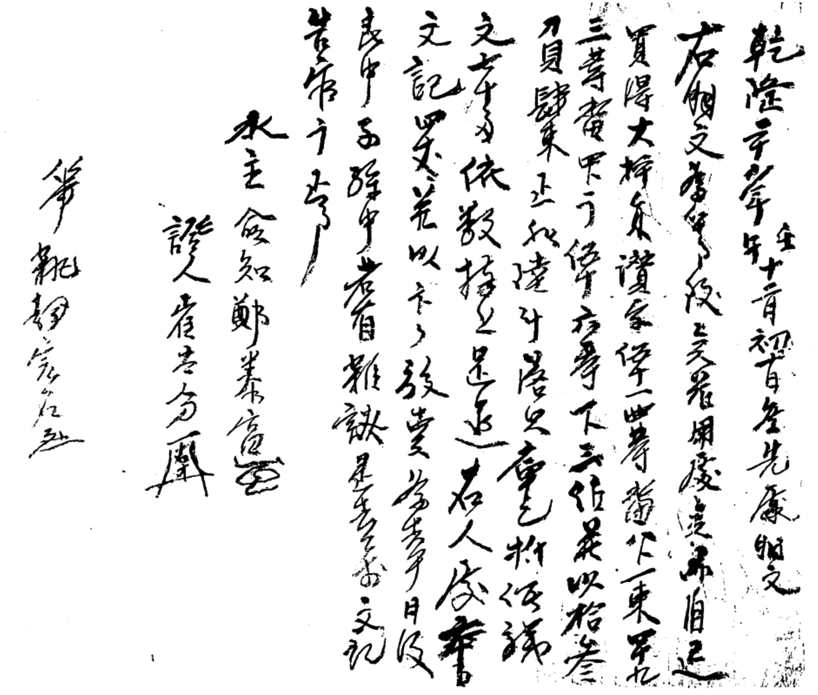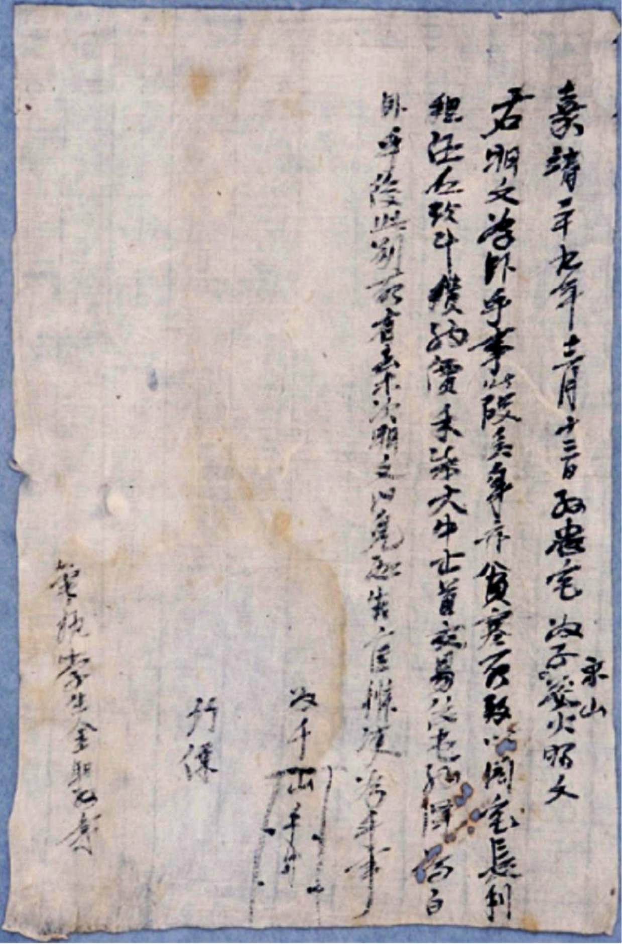 위 그림은 영해 재령이씨(寧海 載寧李氏) 집안의 명문으로 1762년 12월 10일에 답주 첨지 정태부가 김선에게 논을 매도하면서 작성해준 명문이다.