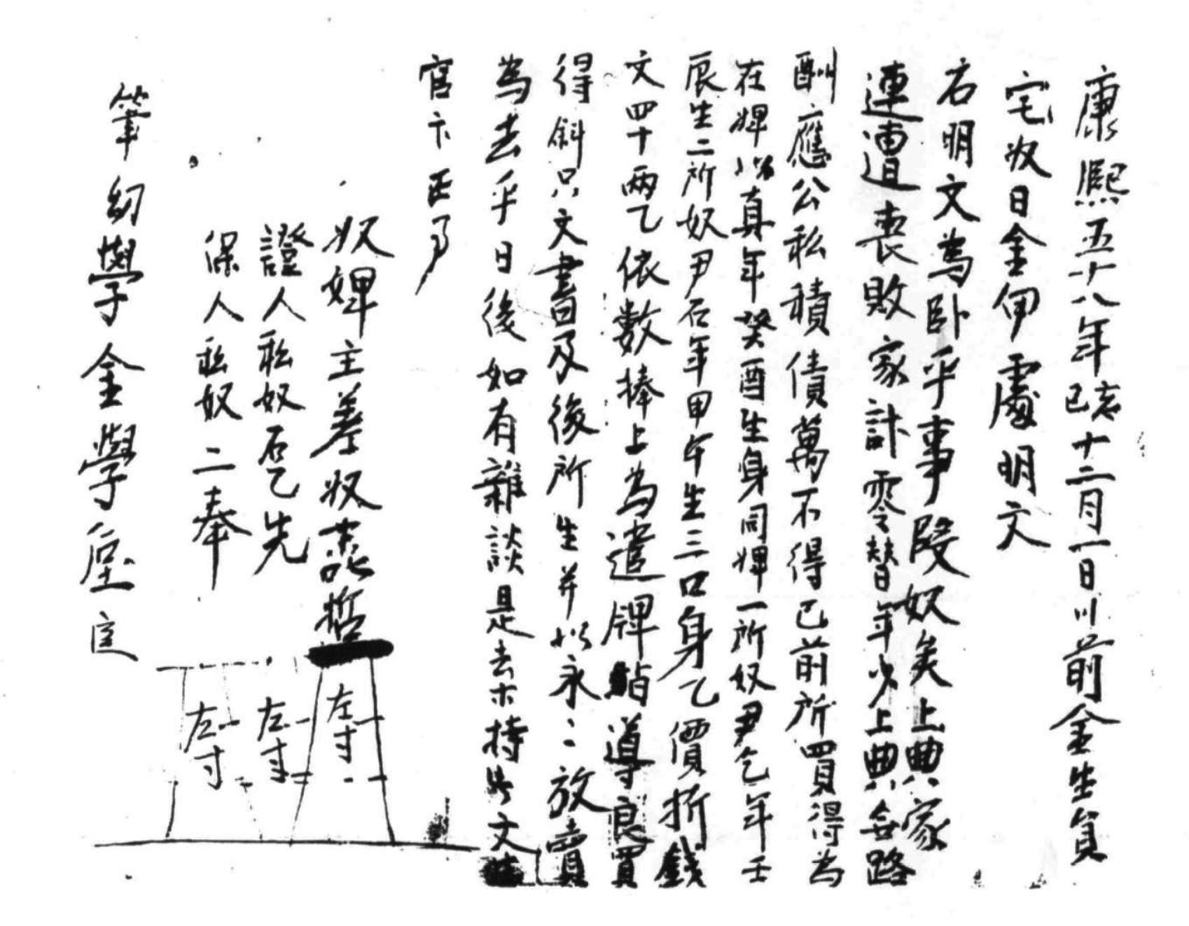 이 그림은 1719년 12월 1일에 노비주(노비주) 차노(差奴) 끝철(唜哲)이 전김생원댁노(前金生員宅奴) 일금이(日金伊)에게 노비를 방매하면서 작성해준 명문이다. 끝철은 상전댁의 상사(喪事)로 인해 공사채(公私債)가 적체(積滯)되어 상전댁의 가계가 궁핍해지자 노비를 3명을 전문 40냥에 방매하고 있는 것이다.
