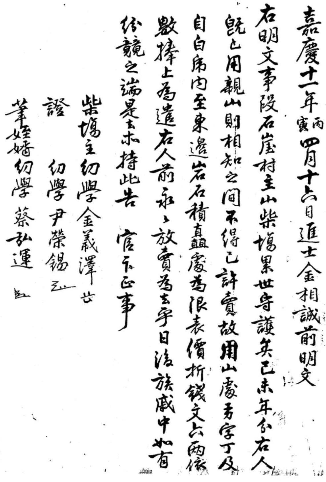 1806년 4월 16일 김희택(金羲澤)은 석애촌(石崖村)에 위치한 시장(柴場, 뗄나무를 구할 수 있는 임야)을 누세수호(累世守護)해오다가 김상성(金相誠) 측이 몇년전부터 친산(親山)으로 삼아 온 점으로 인해 서로 양해하여 이 시장을 김상성 측에 전문 6냥을 받고 방매하고 있는 것이다.