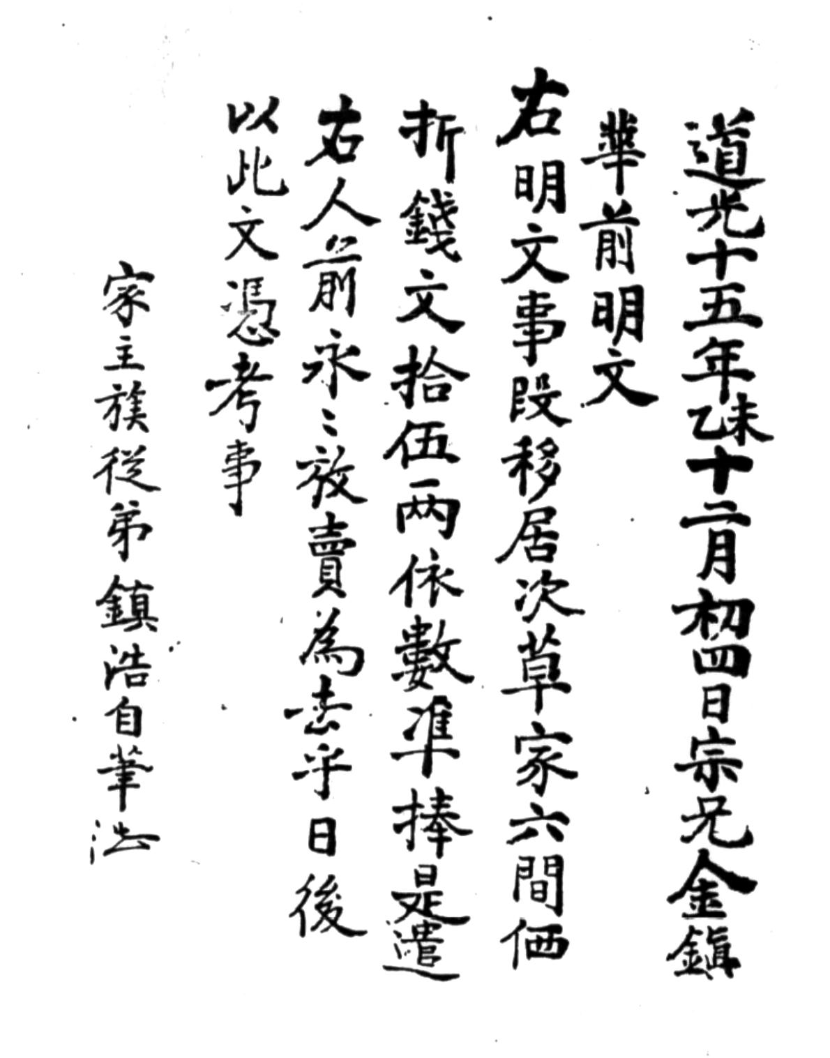 1835년 12월 4일에 집주인인 족종제(族從弟) 김진호(金鎭浩)가 자신이 거주하던 초가 6칸에서 이사(移徙)하여 다른 곳에서 살 목적으로 해당 초가를 종형(從兄) 김진화(金鎭華)에게 전문 15냥을 받고 방매하는 명문이다.